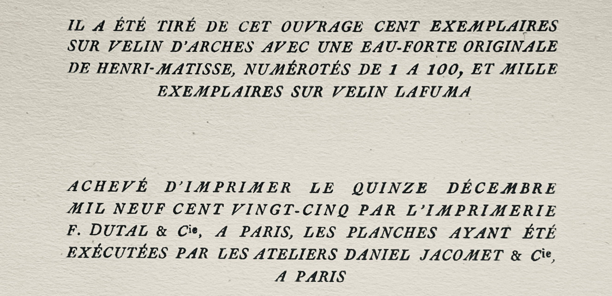 Excerpted from the album (translated from French), This album was printed in C issues on vlin d'Arches with an original issue by Henri-Matisse, numbered from I to C, and M issues on vlin Lafuma.