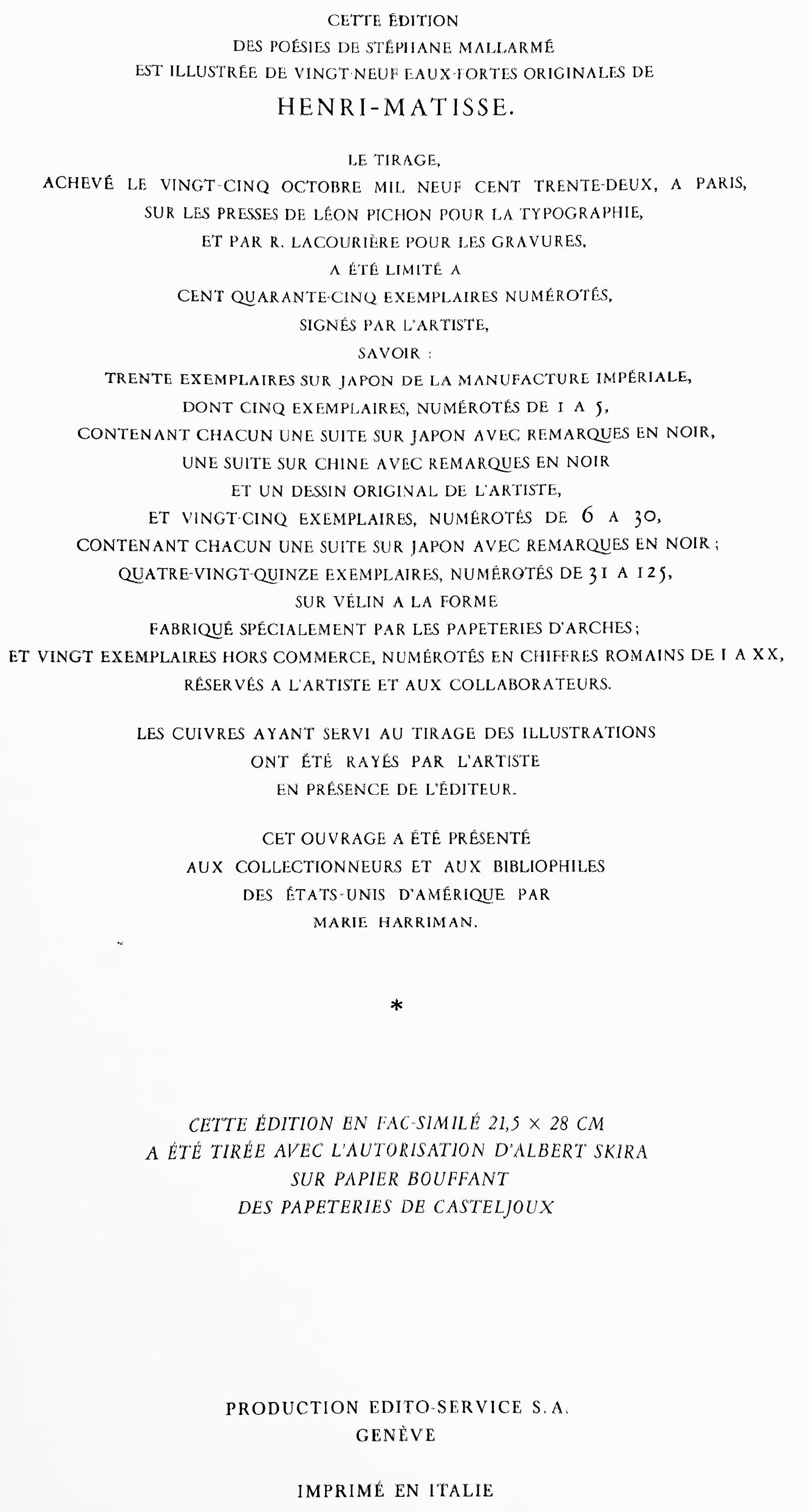 Excerpted from the folio (translated from French), This edition, Poems by Stphane Mallarm, is illustrated with XXIX original etchings by Henri-Matisse.