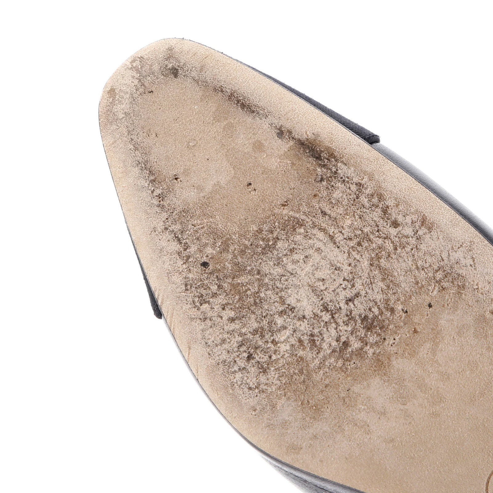 Condition: Very good. Creasing and scuffs throughout, darkening and marks in interior, peeling, darkening, stains, scuffs, and indentations on outer soles, scratches on hardware.