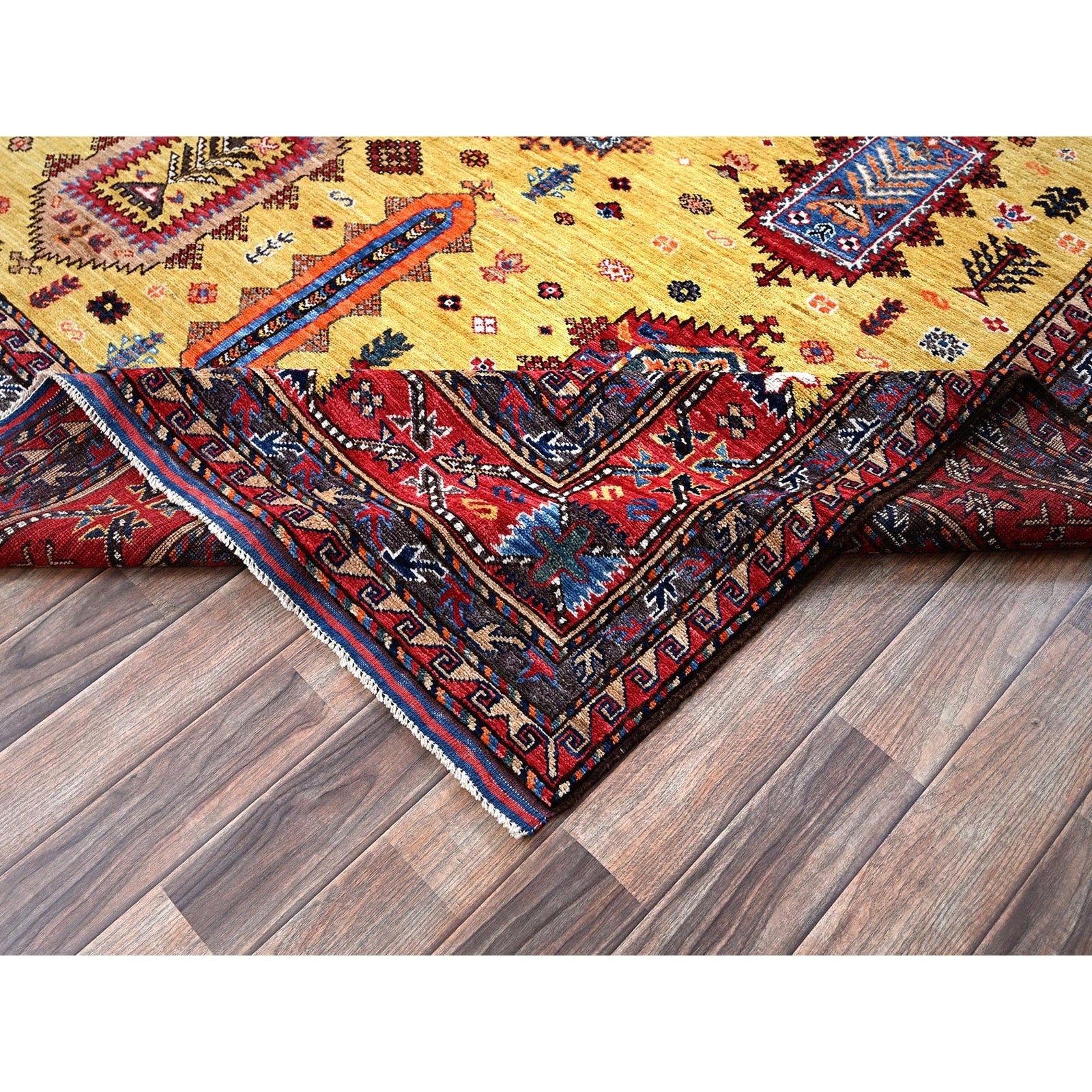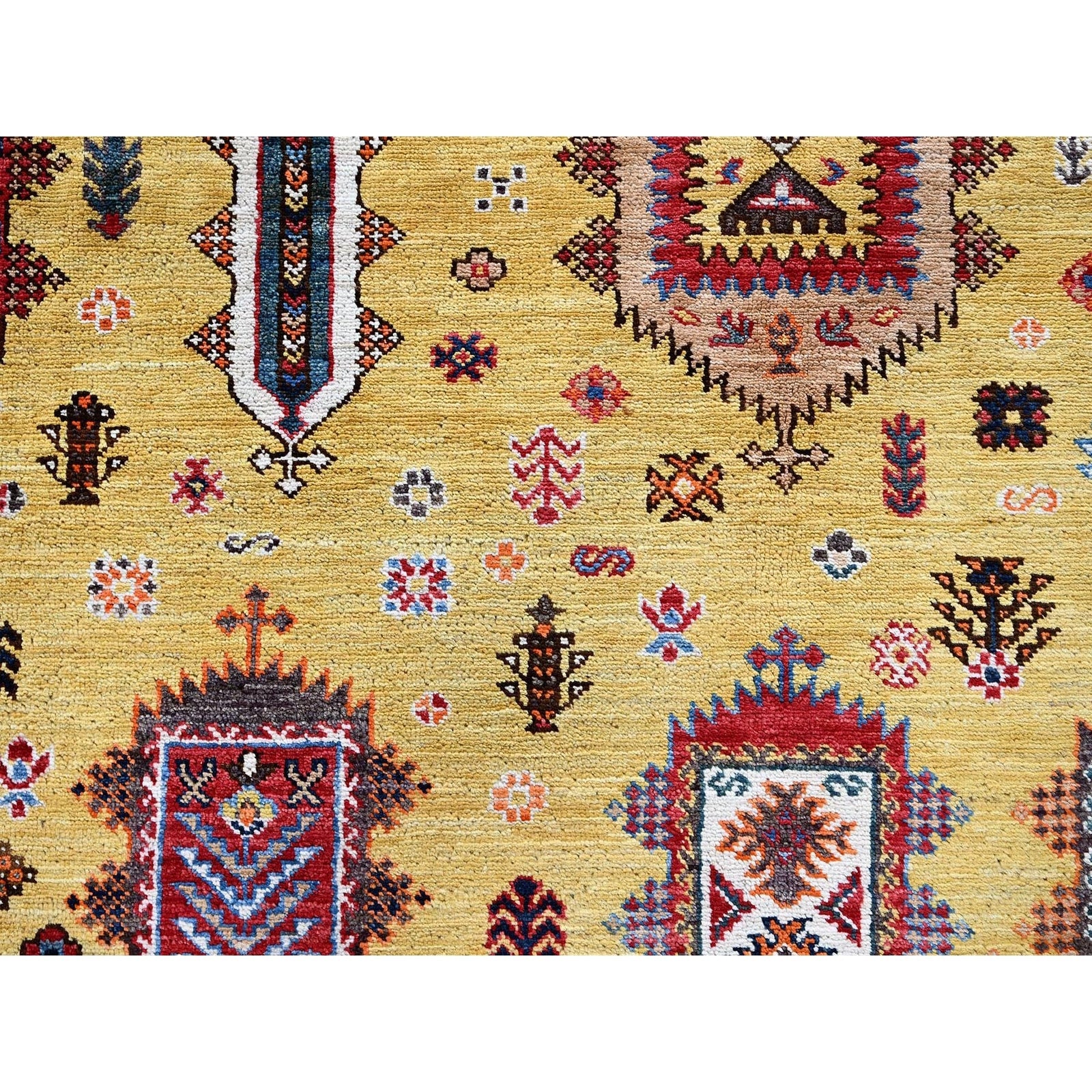 Soft Wool Hand-Knotted Afghan Rug in Yellow with Caucasian Design (8'3"x9'8")