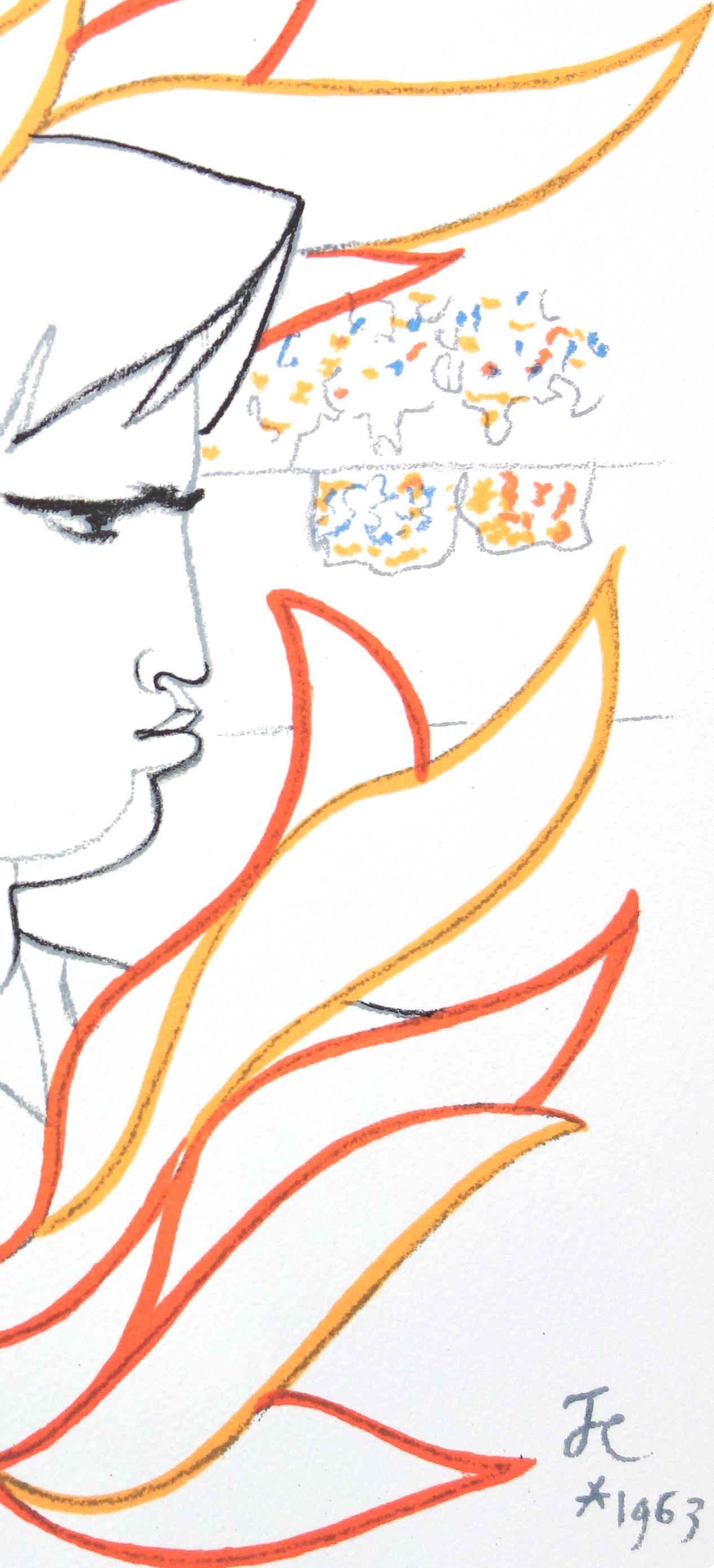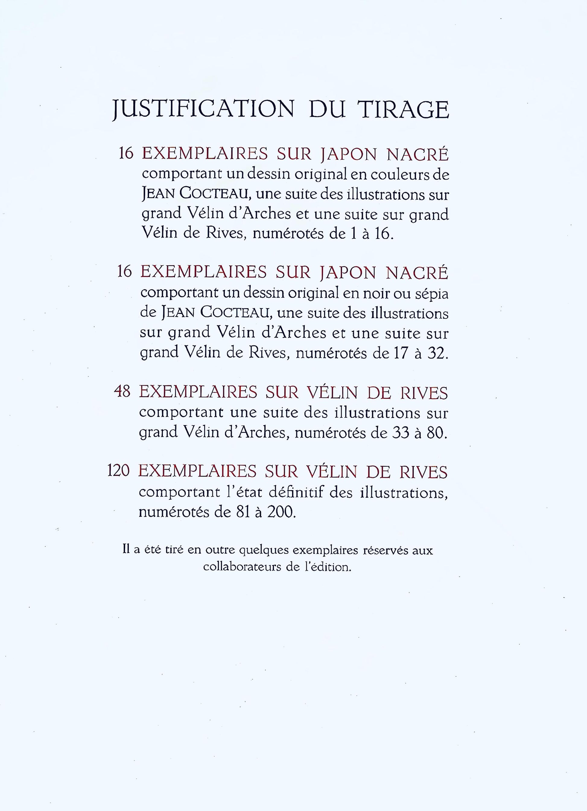 Justification of the draw, XVI examples on Japon nacr with an original color drawing of Jean Cocteau, a suite of the illustrations on grand vlin d'Arches and a suite on grande vlin de Rives, numbered from I to XVI.
