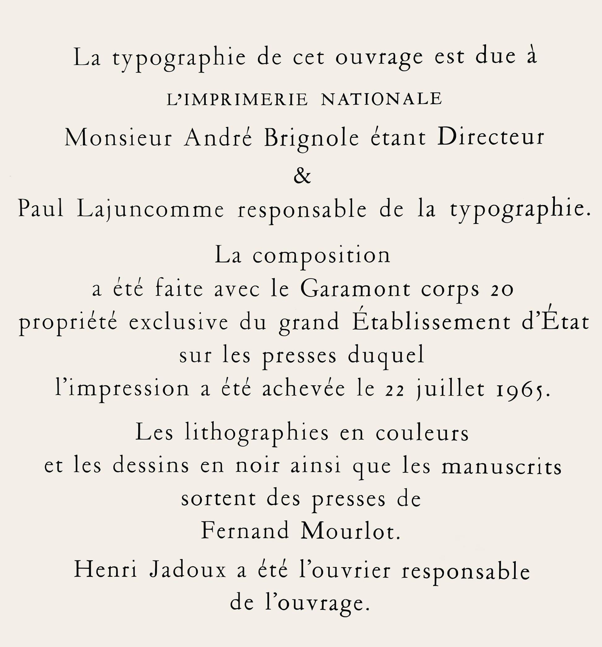 The type-set was made with the Garamont corps 20, exclusive property of the grand tablissement d'tat on the presses of which the printing was completed on July 22, 1965.