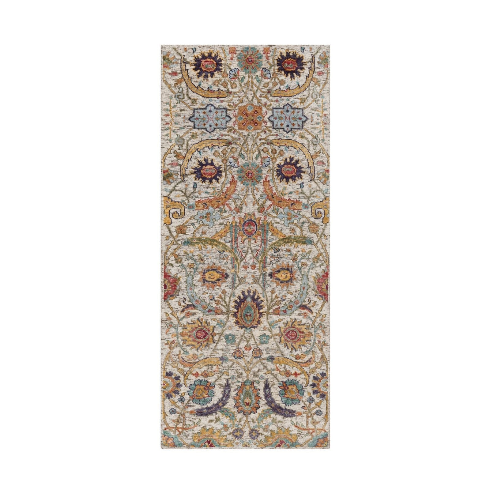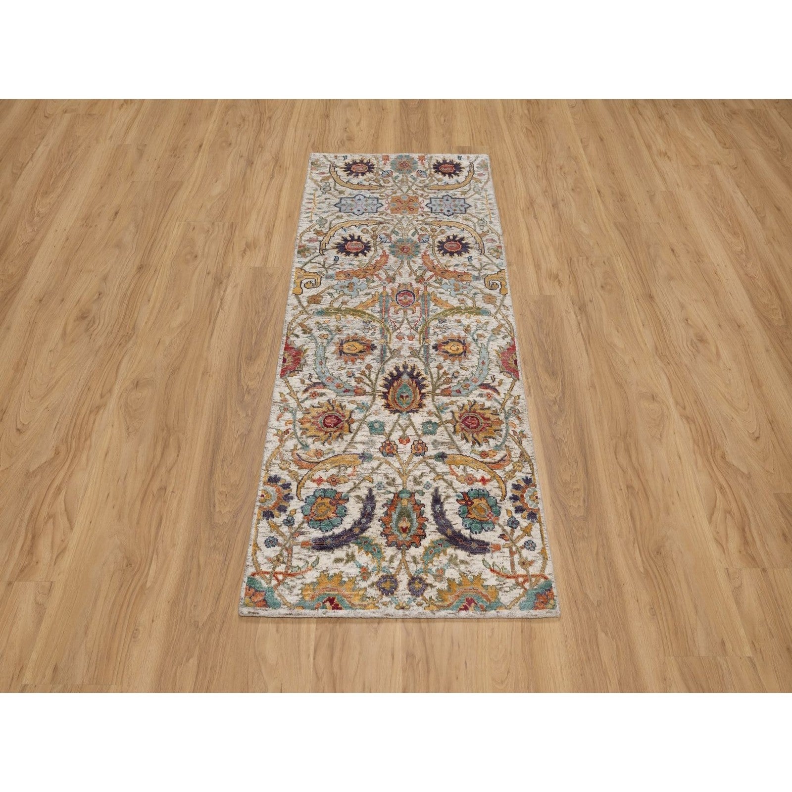 2'5"X6' Ivory Runner Rug Silk With Textured Wool Leaf Design Hand Knotted