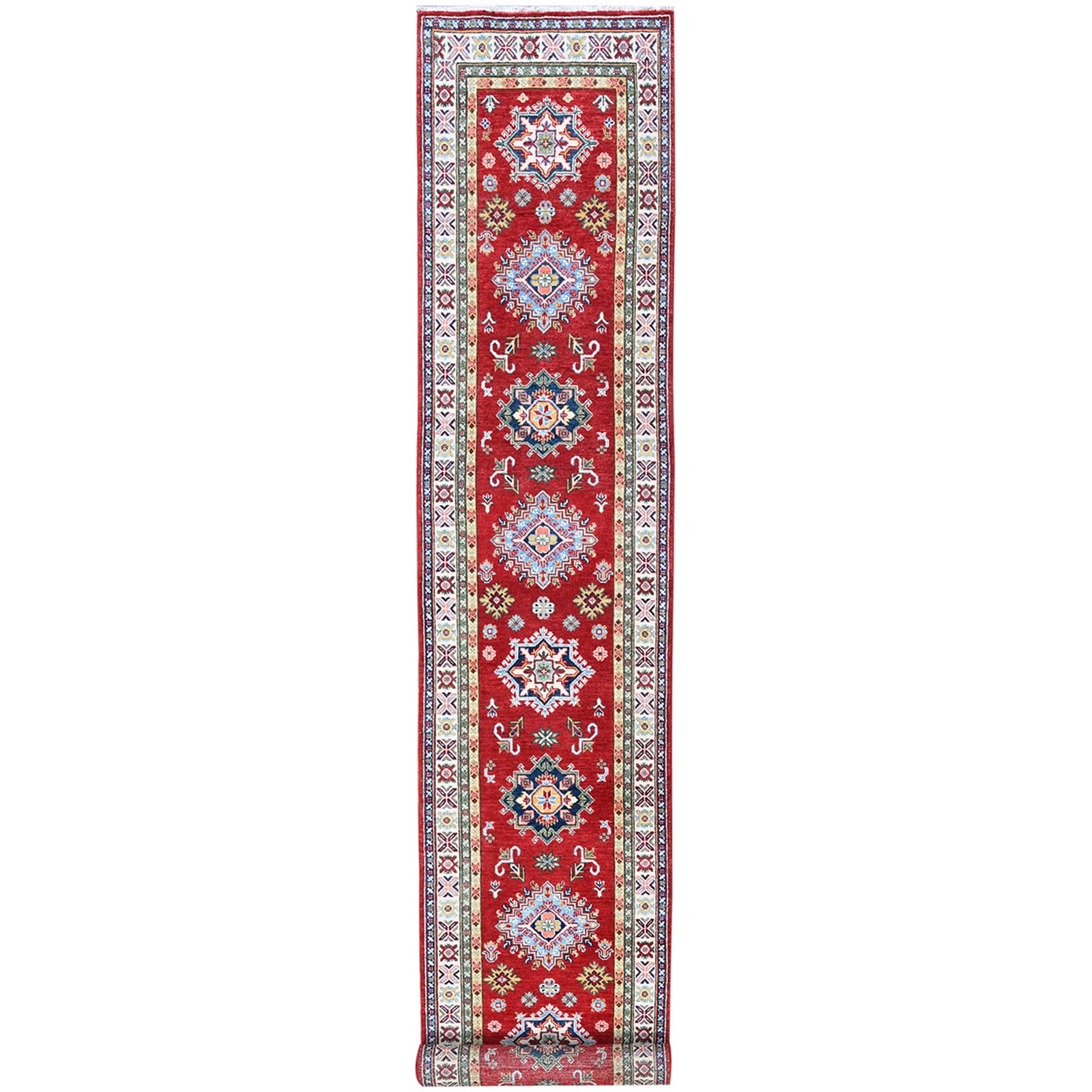 2'9"X16'5" Red Kazak With Tribal Design Soft Wool Hand Knotted Runner Rug