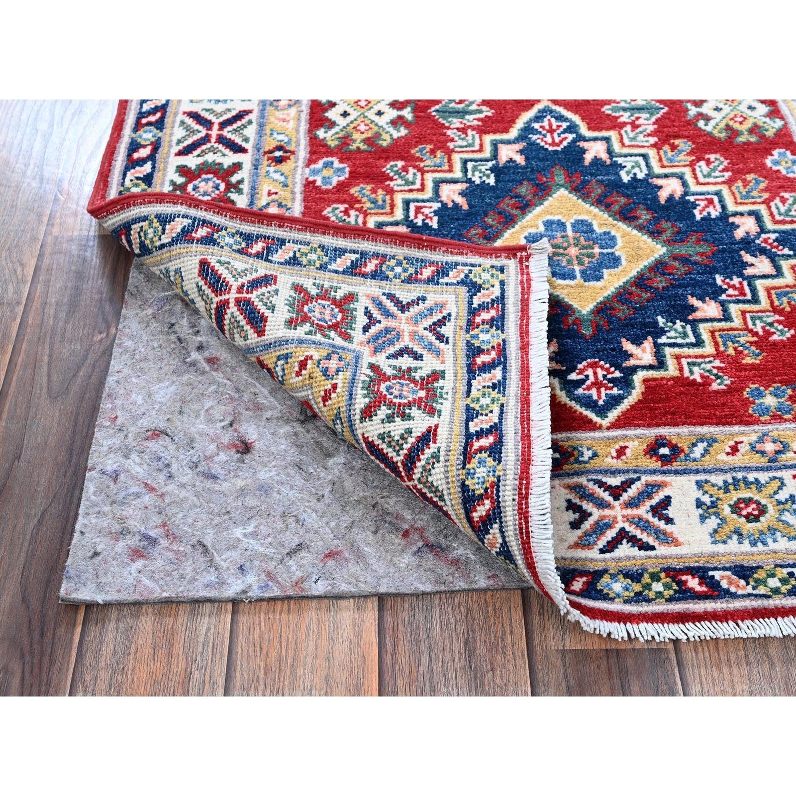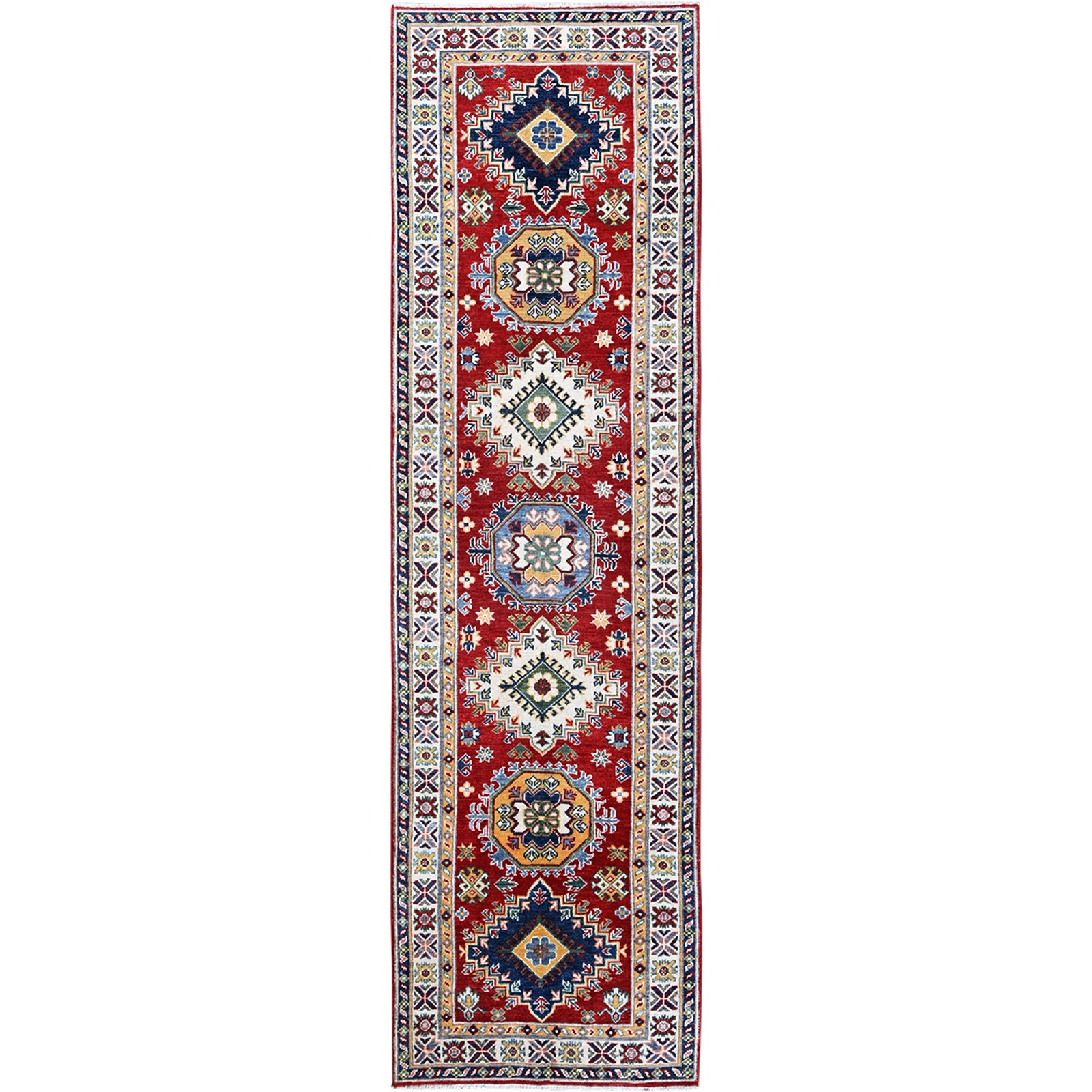 2'9"X9'8" Red Kazak With Geometric Design Soft Wool Hand Knotted Runner Rug