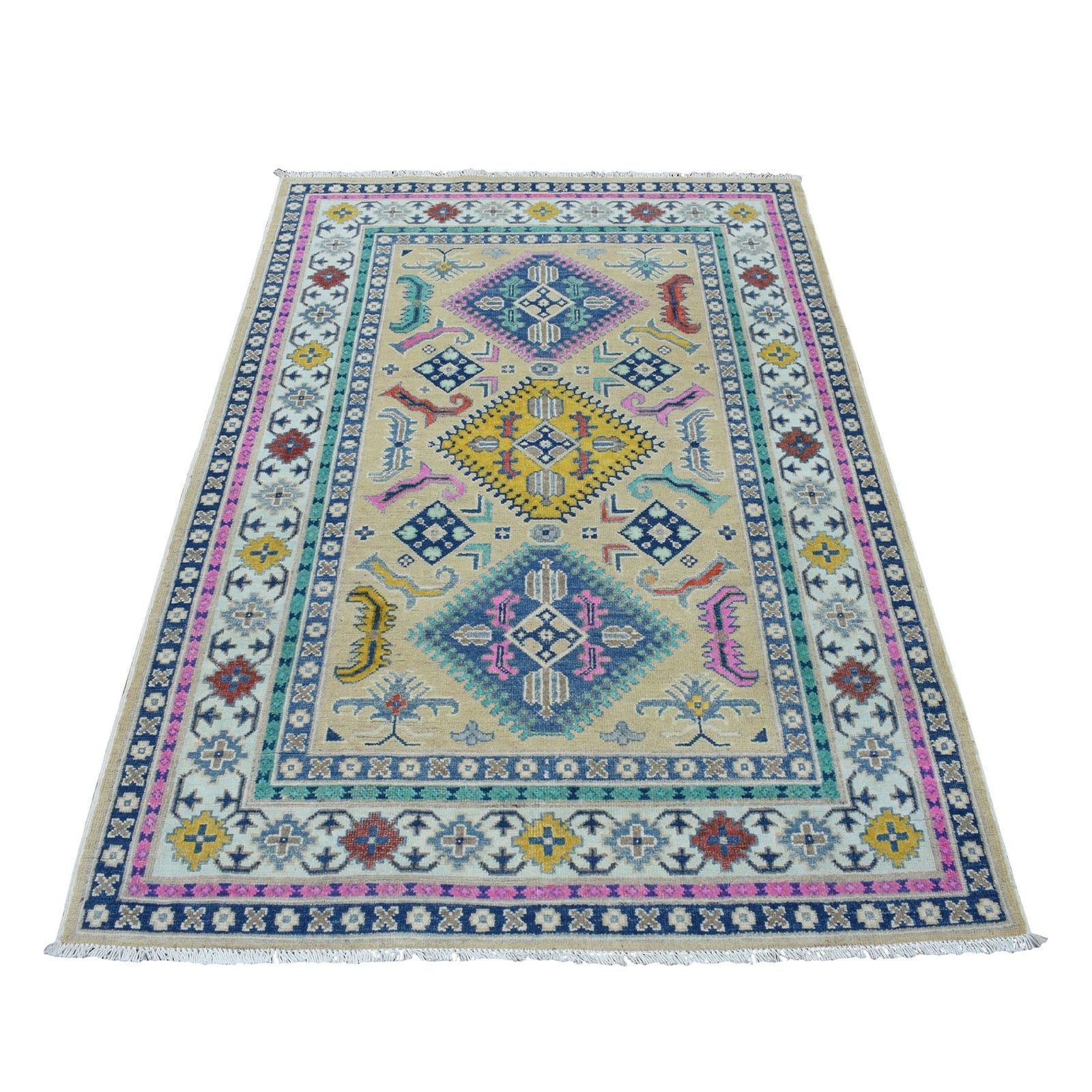 4'1"X6'1" Colorful Beige Fusion Kazak Pure Wool Handknotted Oriental Rug