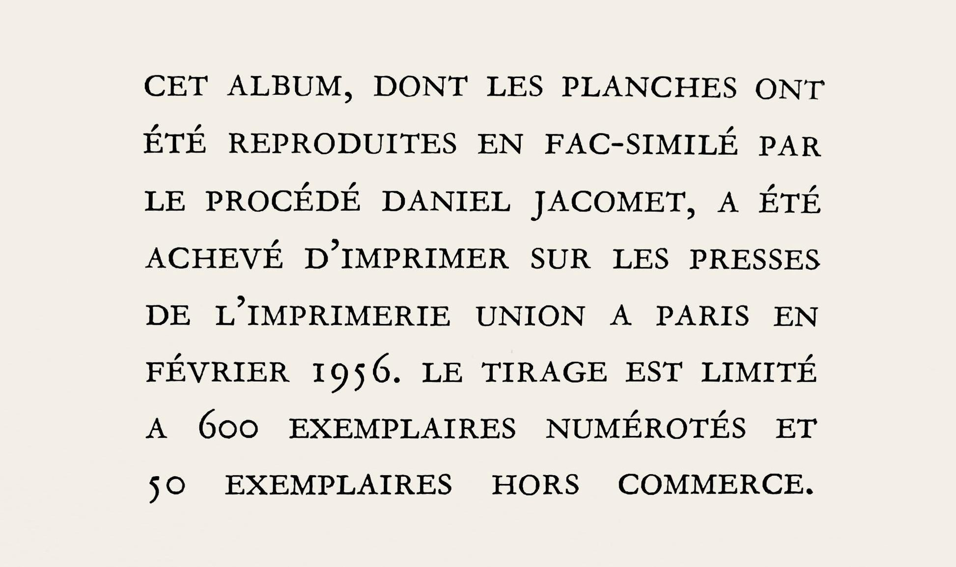 This album, whose plates were shot in pochoir by the procd Daniel Jacomet, was completed to print on the presses of L'Imprimerie Union in Paris in February 1956. The circulation is limited to DC numbered examples and L examples out of trade.