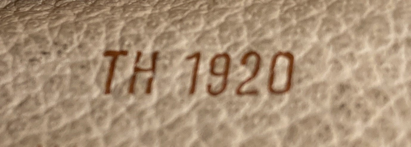Condition: Very good. Minor odor in interior. Creasing and wear on exterior, wear, darkening, small stains, and pen marks in interior, scratches and tarnish on hardware.