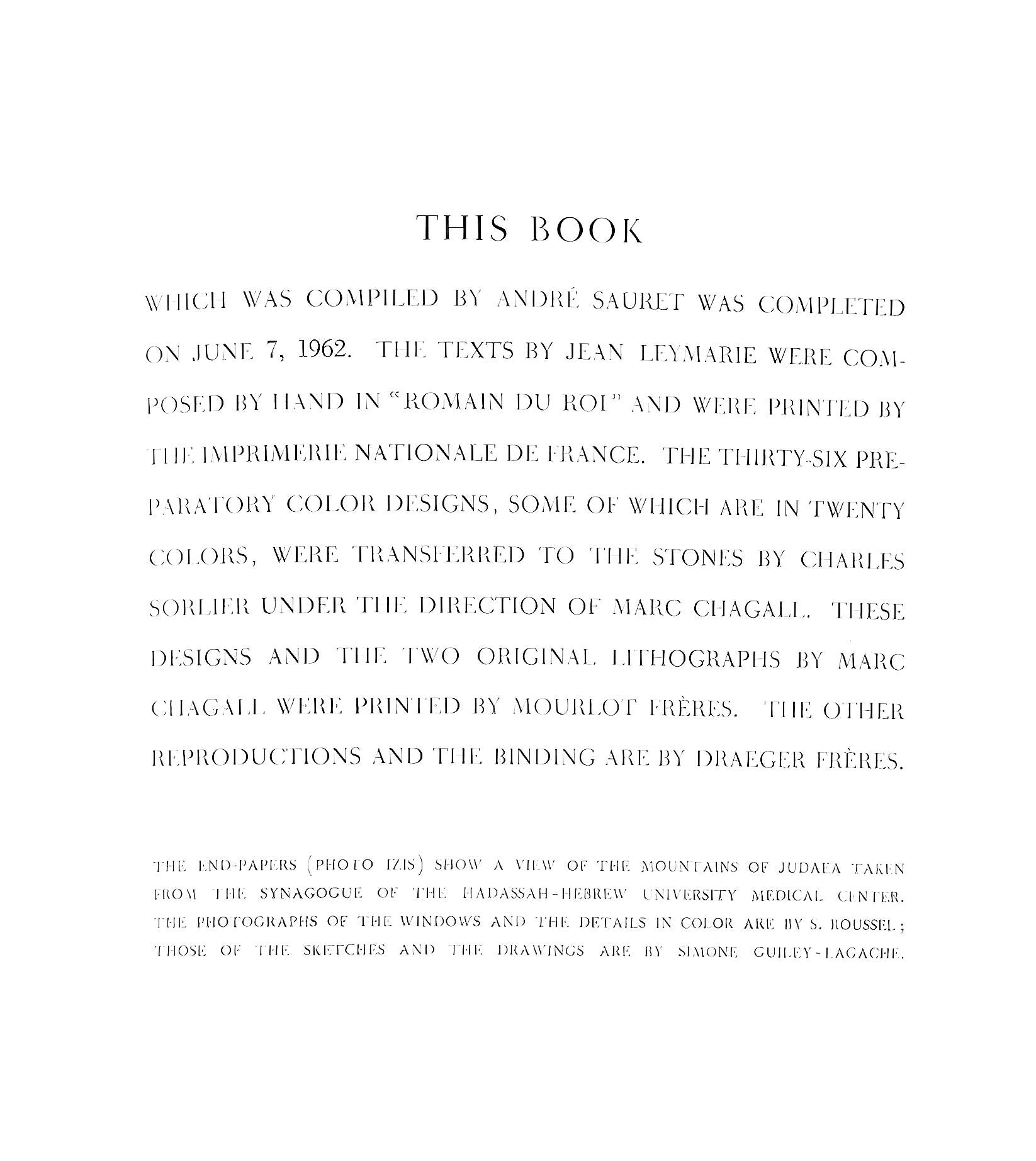 These designs and the two original lithographs by Marc Chagall, were printed by Mourlot Frres.
