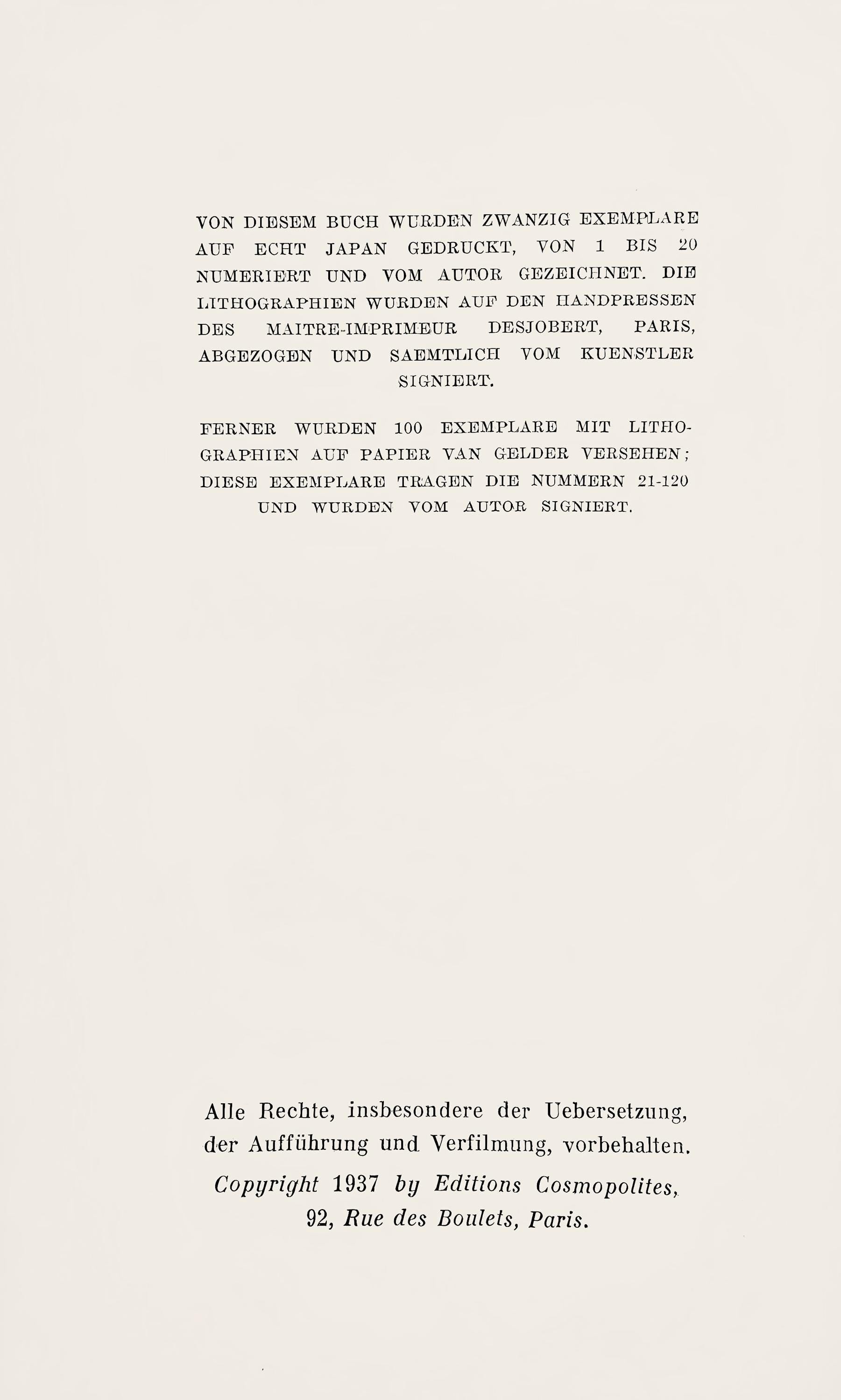 Published by ditions Cosmopolites, Paris; printed by Matre-Imprimeur, Desjobert, Paris, 1937.