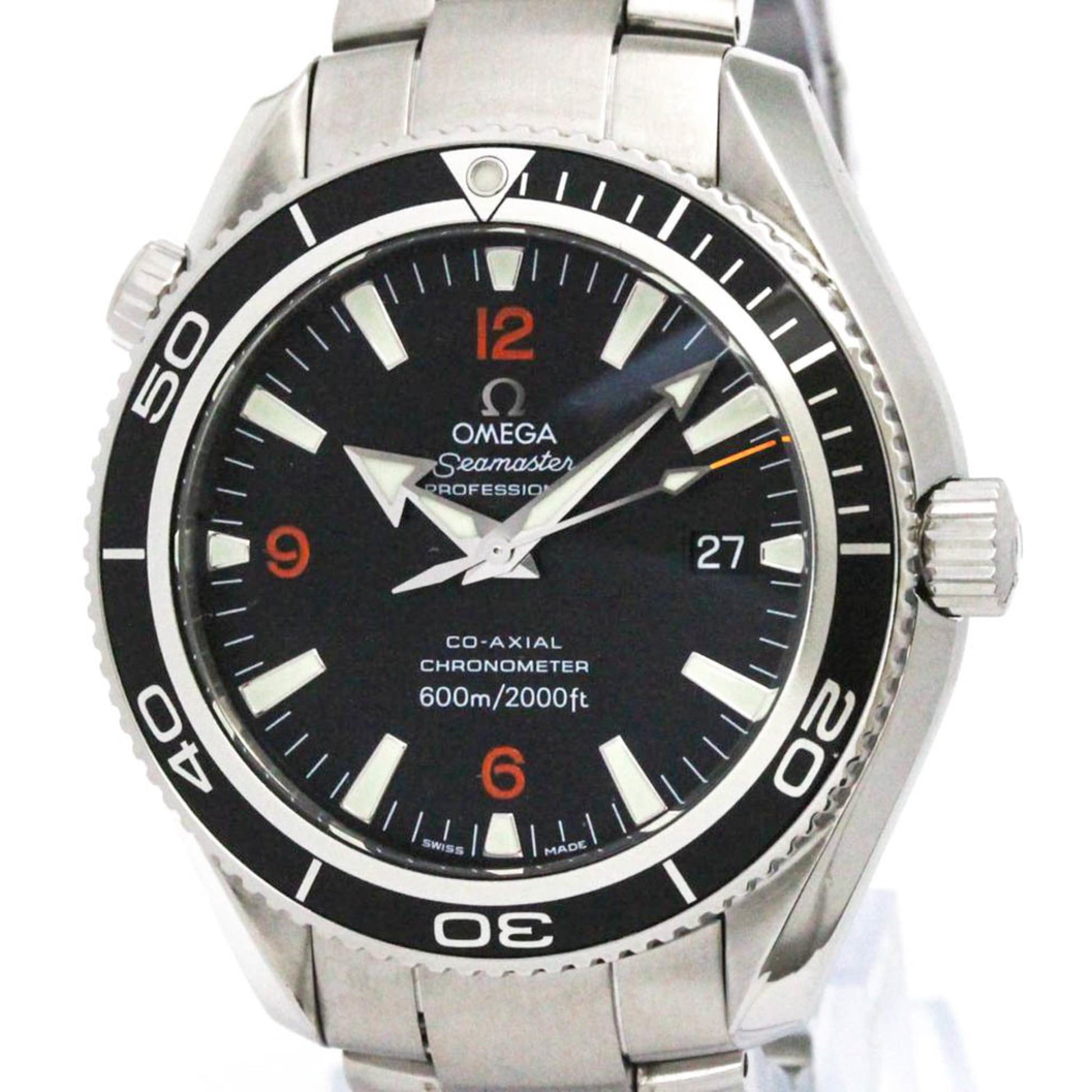 The OMEGA Seamaster Planet Ocean watch features a 42mm stainless steel case and band, with a black dial; it's used but in very good condition exhibiting minor traces of usage.
