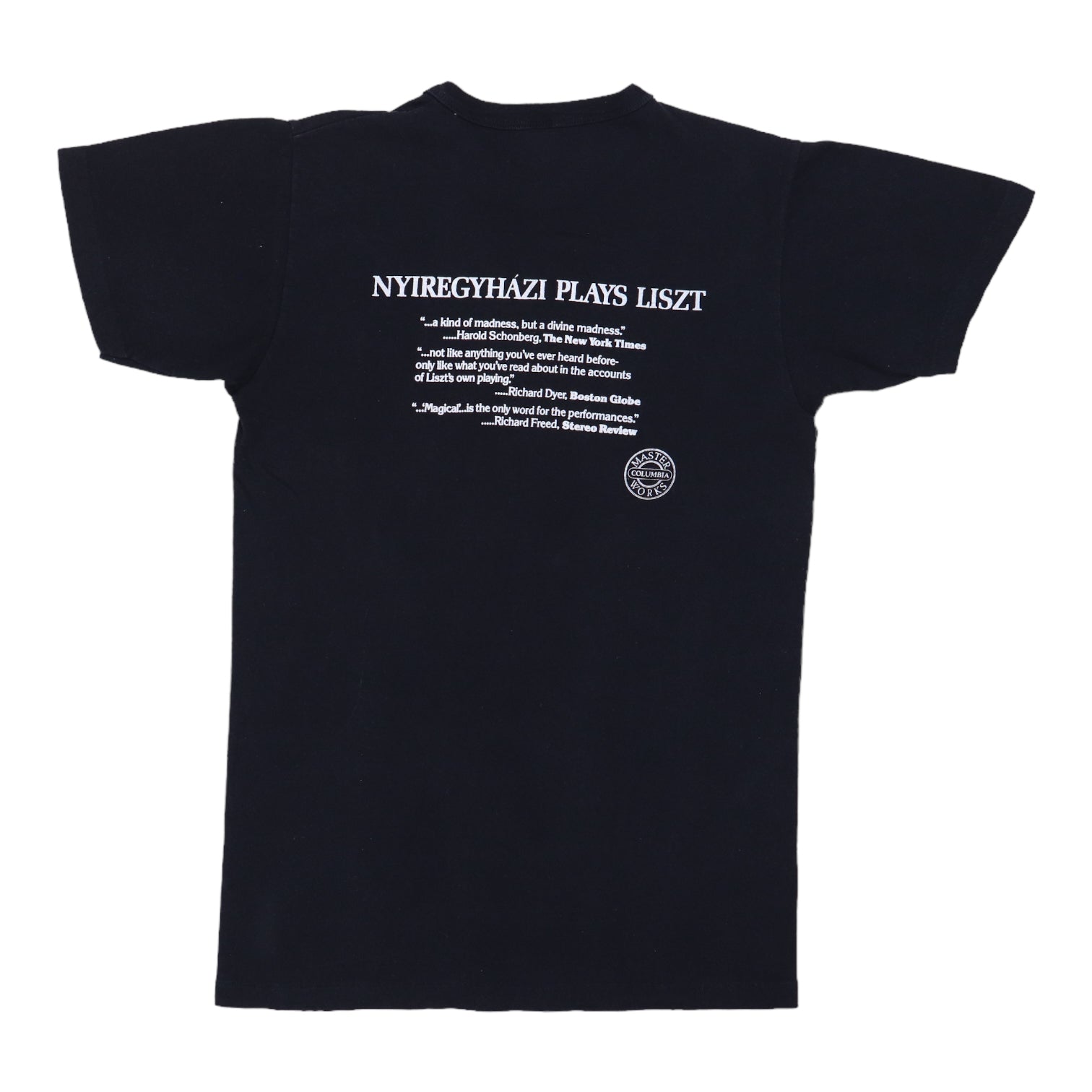 Original vintage 1970s Ervin Nyiregyhzi Plays Liszt Shirt. This is a true vintage shirt, not a modern reproduction. Sizes vary so please use measurements for best idea on fit. Front and back graphics. Shirt is in good condition, no holes, discoloration on front. This shirt will arrive washed and ready to wear.