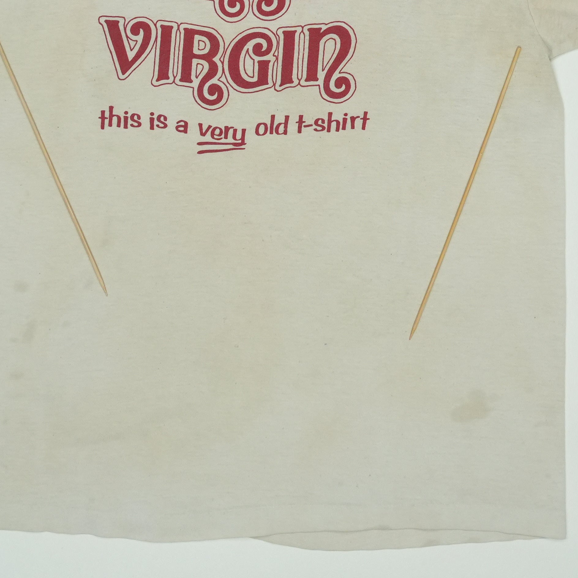 Original vintage 1970s I'm A Virgin Shirt. This is a true vintage shirt, not a modern reproduction. Sizes vary so please use measurements for best idea on fit. Front and back graphics. Shirt is in worn condition, small holes & discoloration throughout. This shirt will arrive washed and ready to wear.