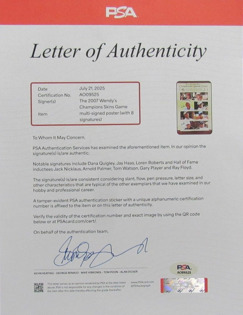 2007 Golf Poster Multi-Signed (8) Palmer Nicklaus Watson Player 24X36 Photo Psa