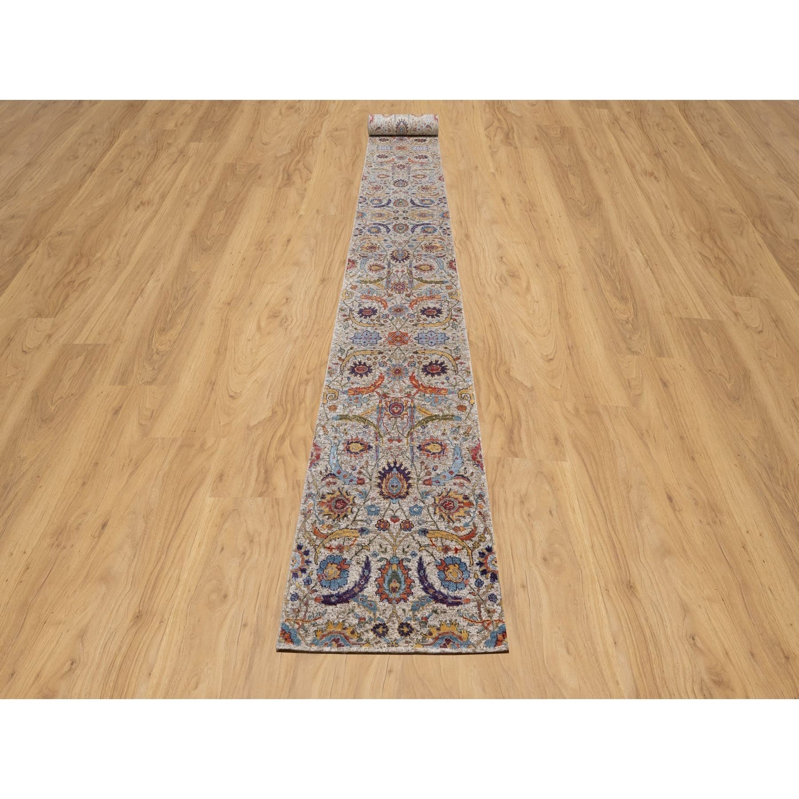 2'5"X26' White Silk With Wool Hand Knotted Sickle Leaf Design Runner Rug