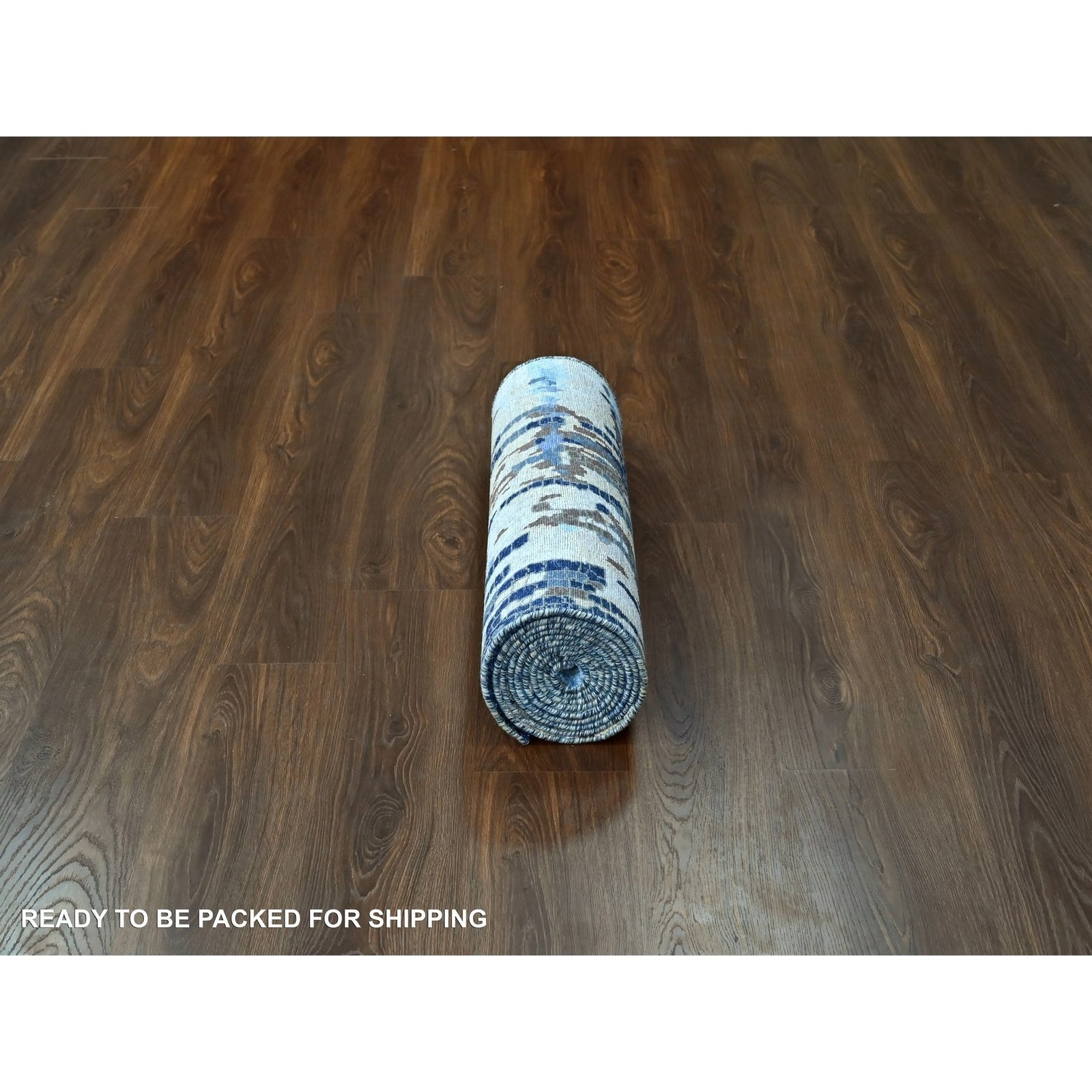 2'6"X12' Yale Blue Mosaic Design Hand Knotted Wool And Silk Runner Rug