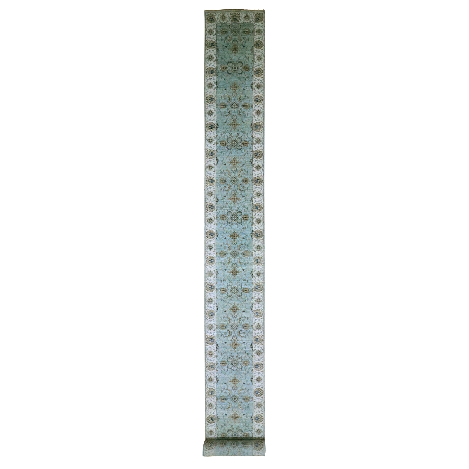 2'6"X25'7" Crystal Blue Pure Wool Vines Design Hand Knotted Xl Runner Rug