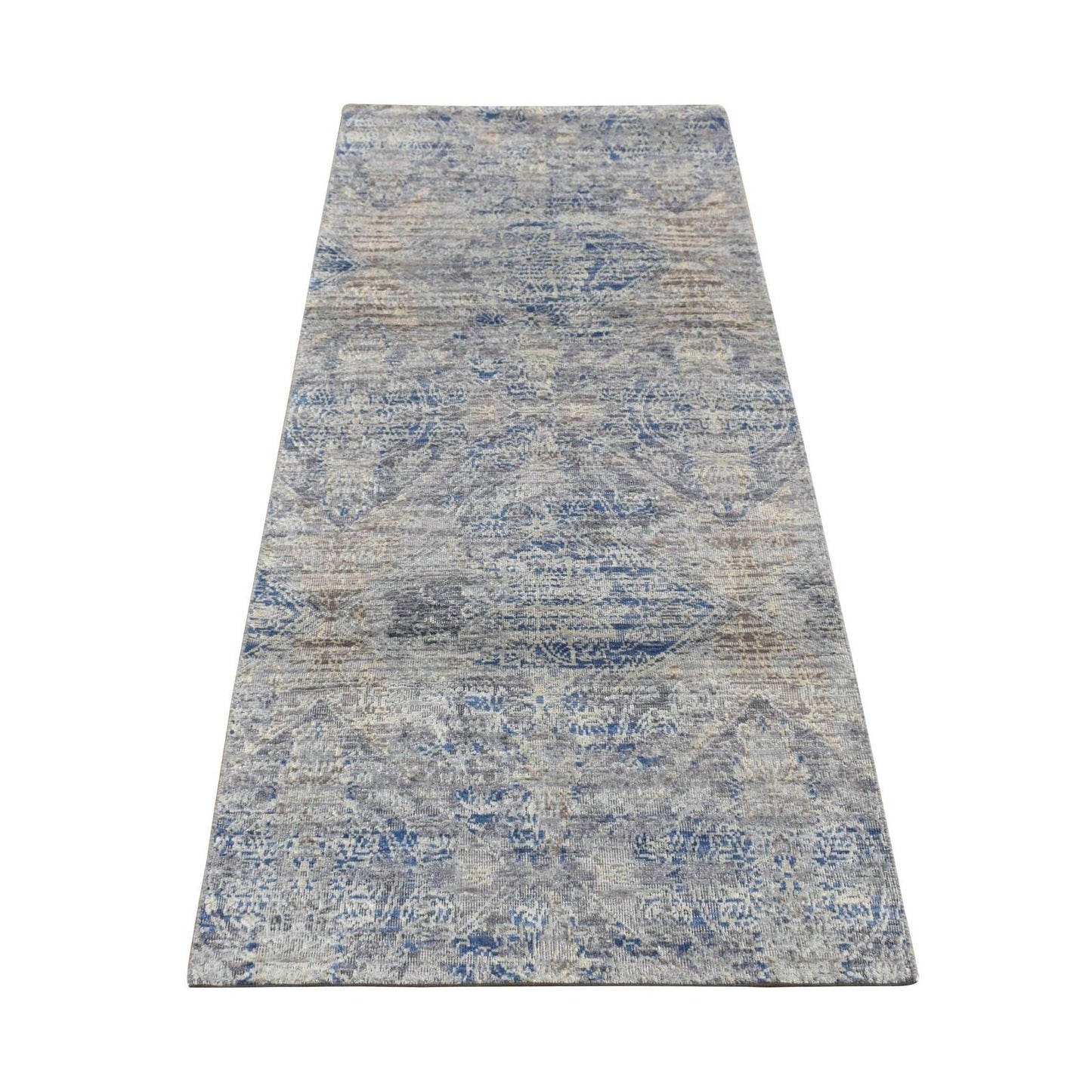 2'6"X6' Blue Silk With Wool Erased Rosette Design Hand Knotted Runner Rug