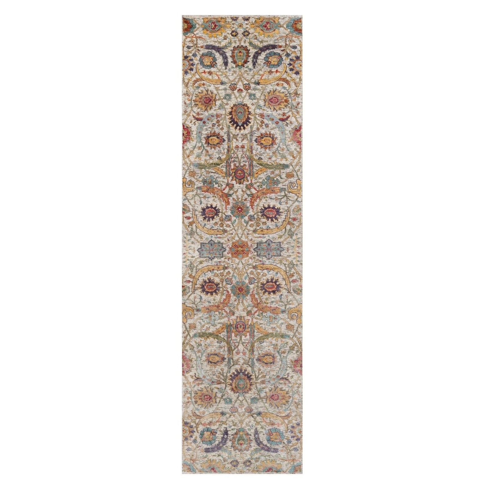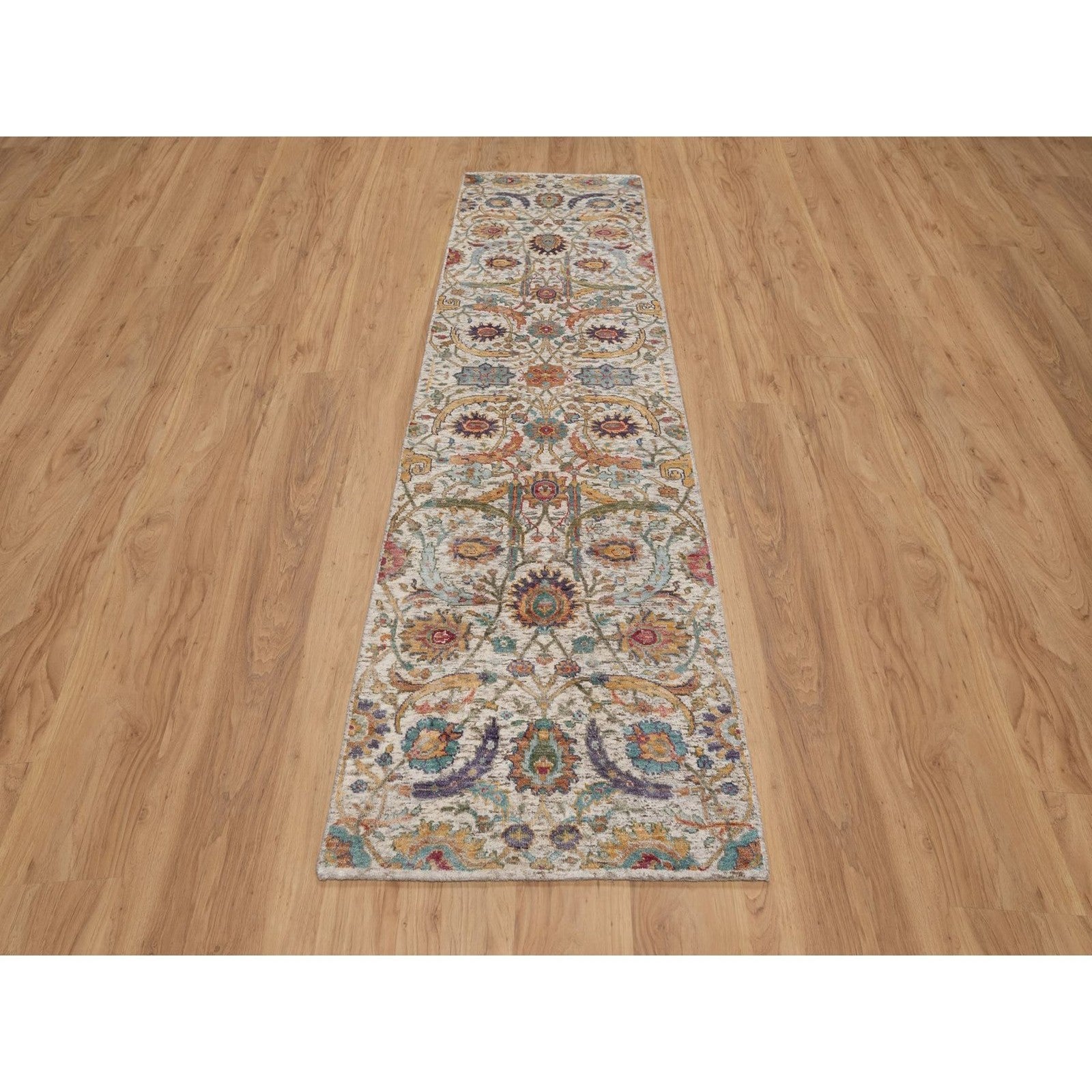 2'7"X10' Ivory Sickle Leaf Design Runner Rug Hand Knotted Silk With Wool