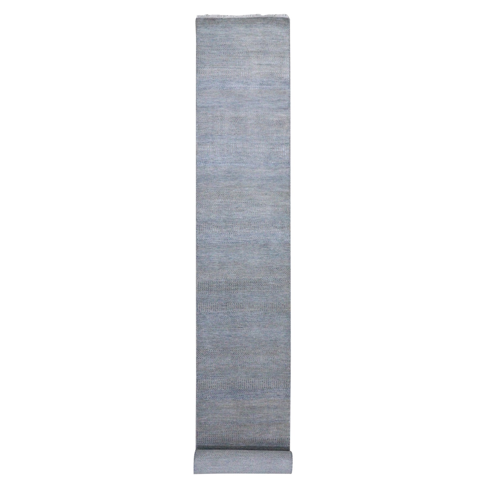2'7"X15'5" Blue Modern Grass Design Wool And Silk Hand Knotted Runner Rug