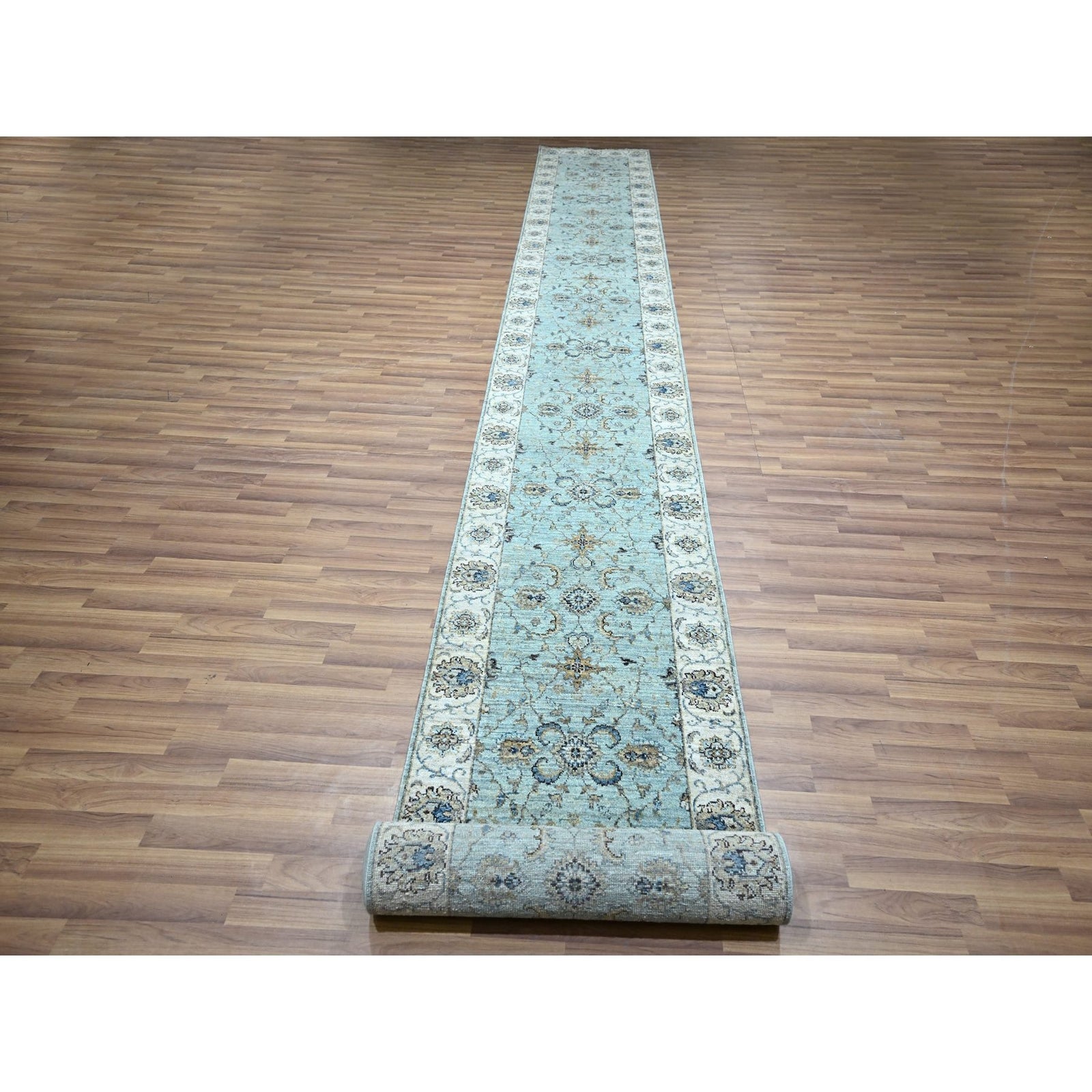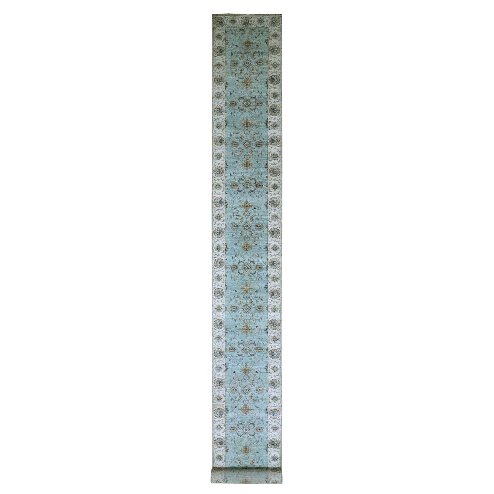 2'7"X22' Sky Blue Hand Knotted Agra Flower Design Pure Wool Xl Runner Rug
