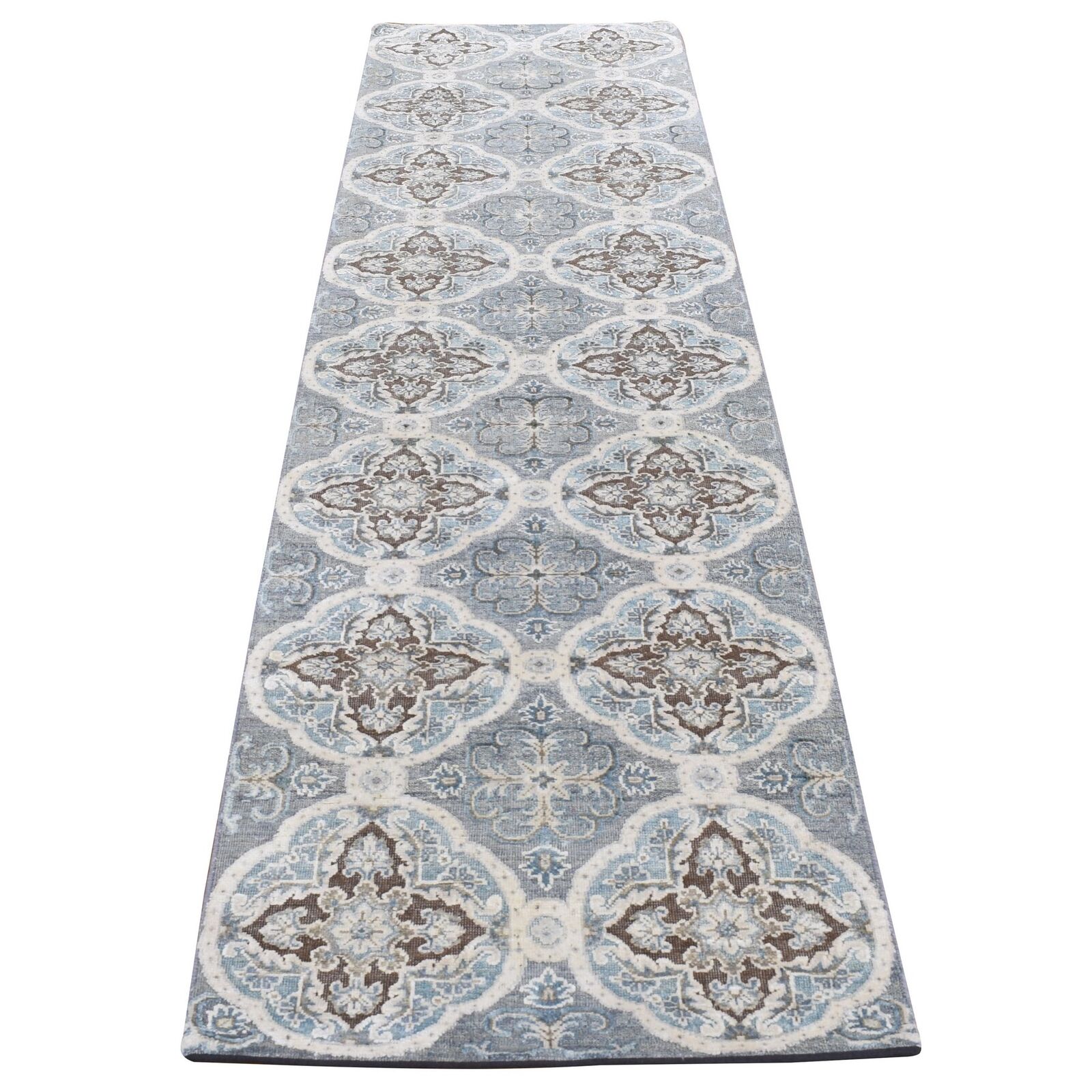 2'7"X9'10" Gray Mughal Design Silk With Wool Hand Knotted Runner Rug