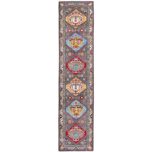 2'8"X12' Gray Kazak Medallions Design Hand Knotted Soft Wool Runner Rug
