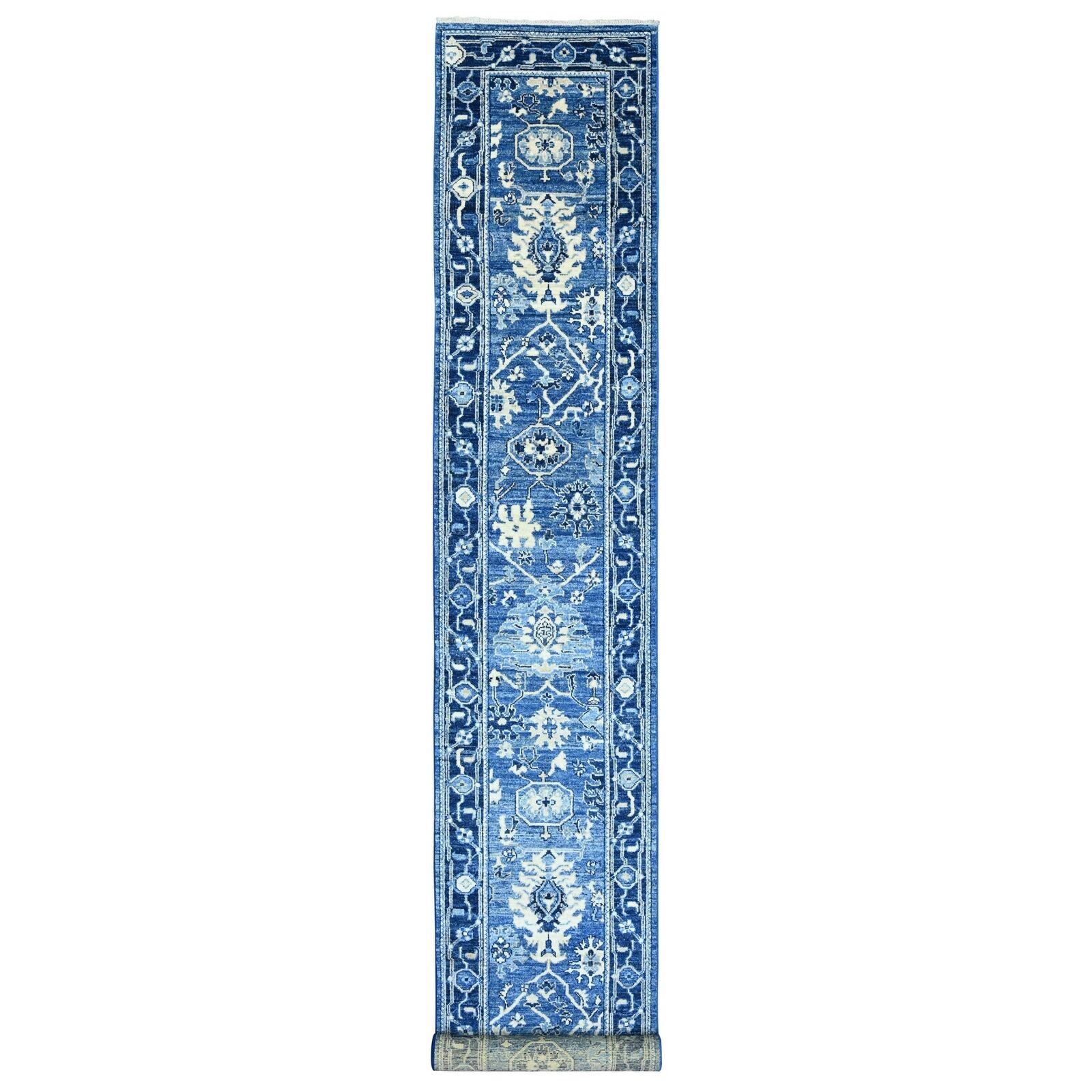 2'9"X19'7" Blue Hand Knotted Angora Oushak Leaf Design Wool Runner Rug