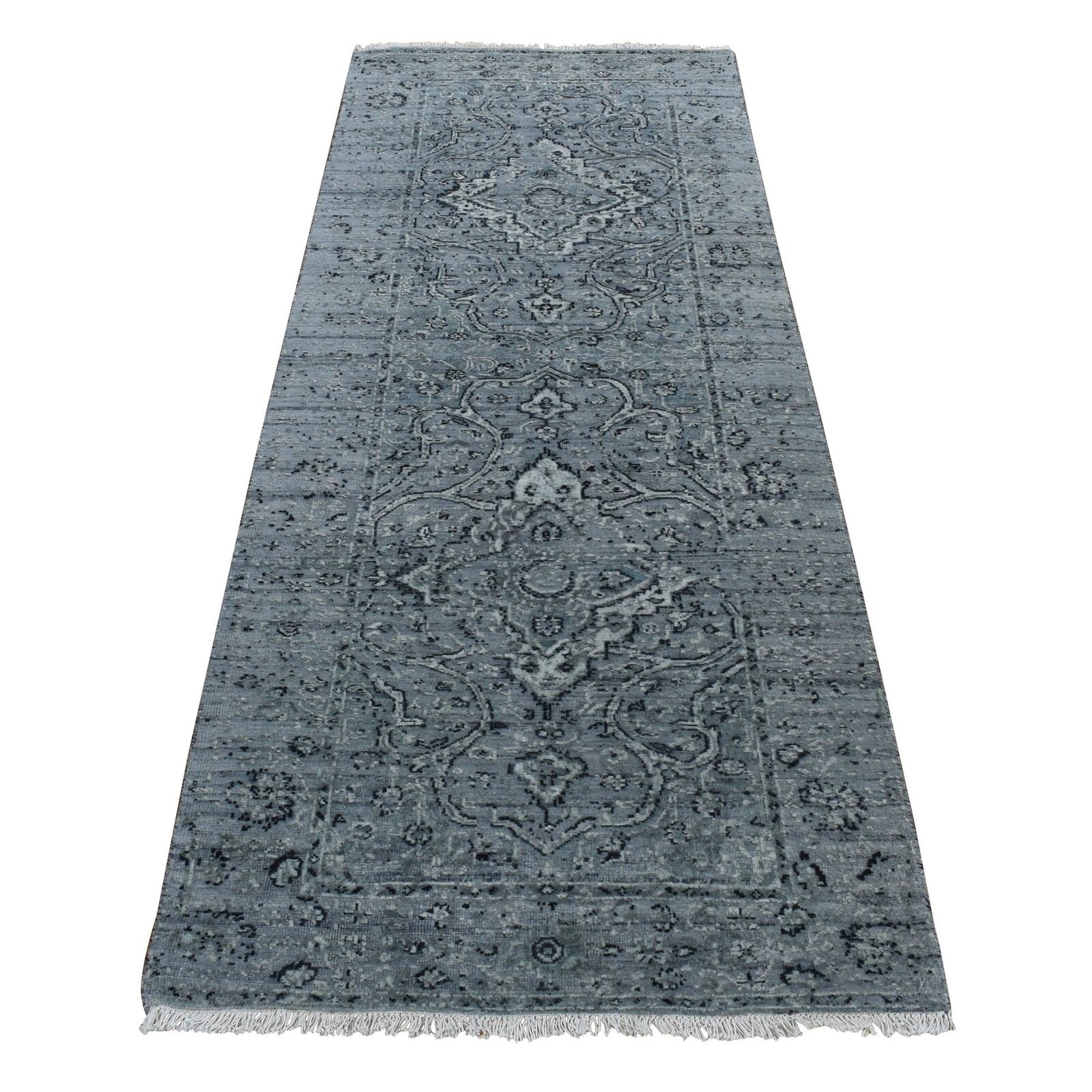 2'9"X7'10" Gray Zoroastrian Design Silk With Wool Hand Knotted Runner Rug