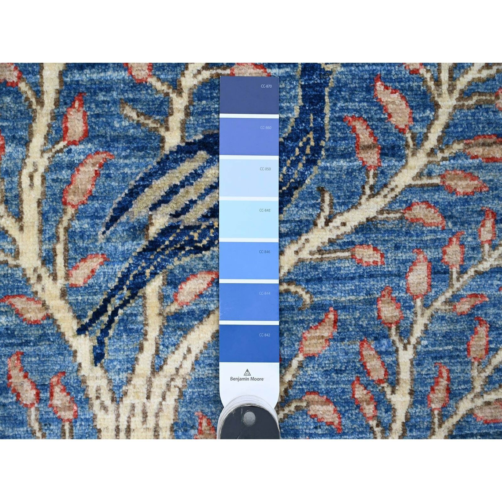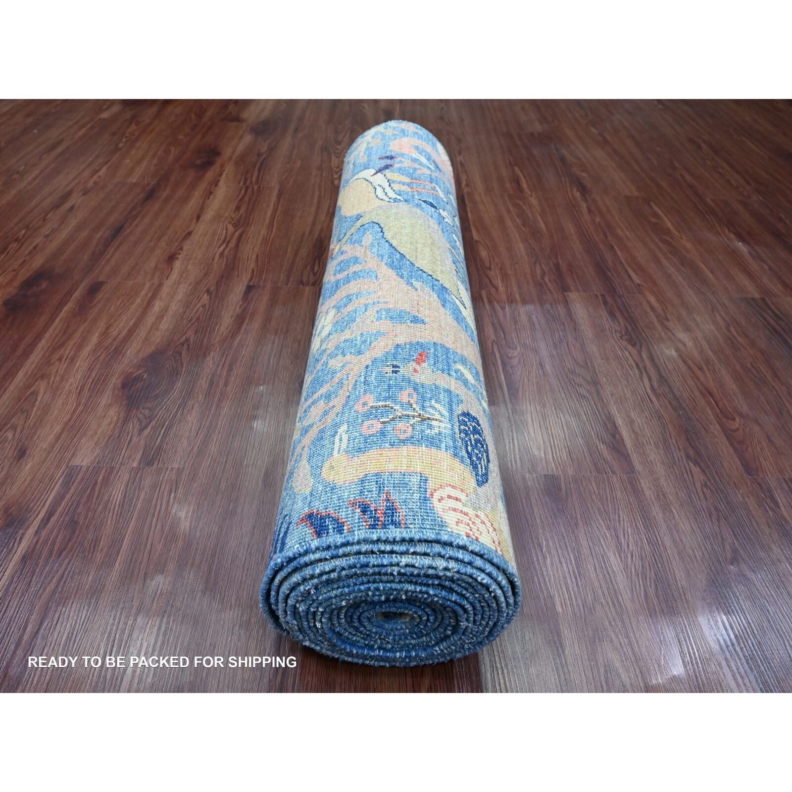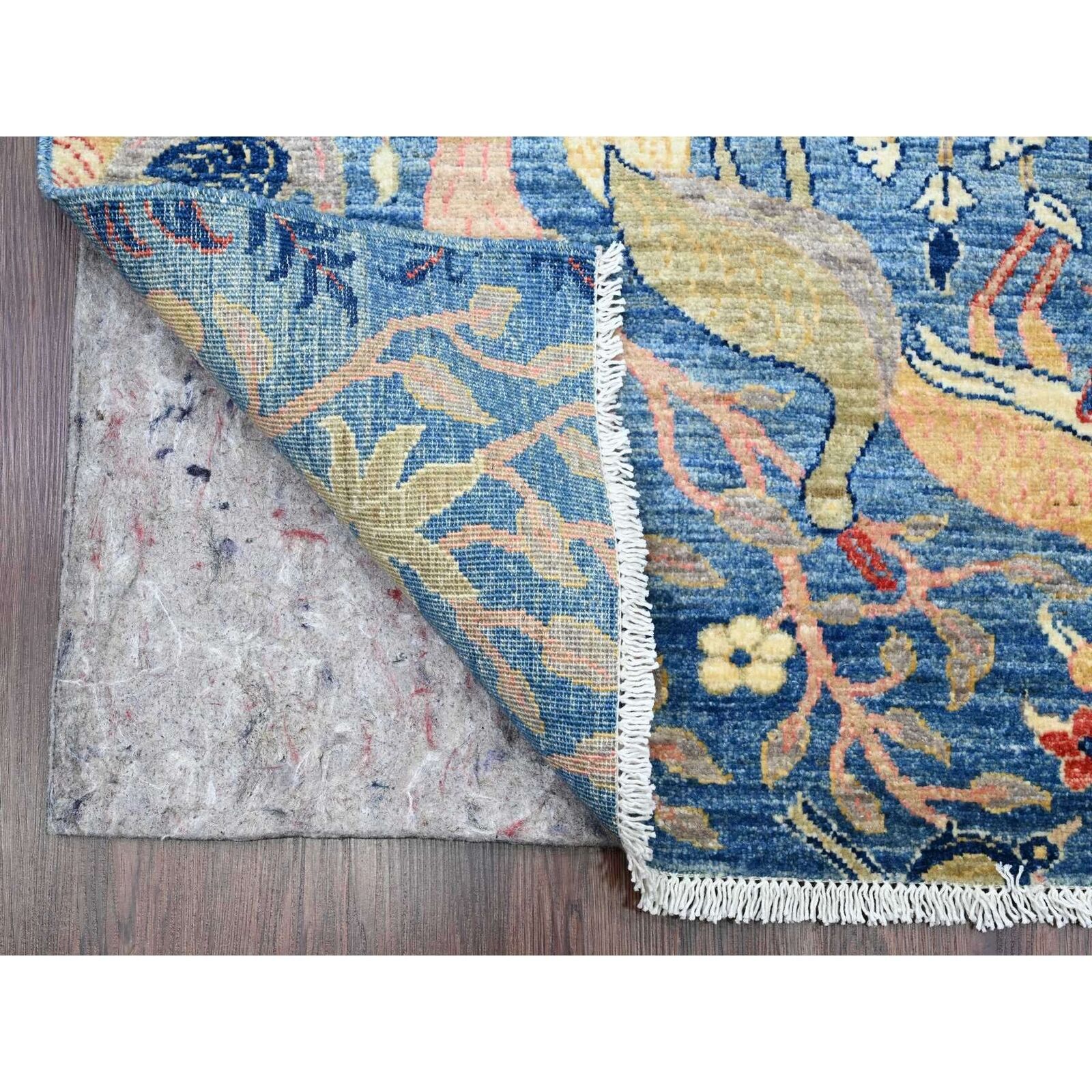 3'1"X19'4" Blue Afghan Peshawar Birds Design Hand Knotted Wool Runner Rug