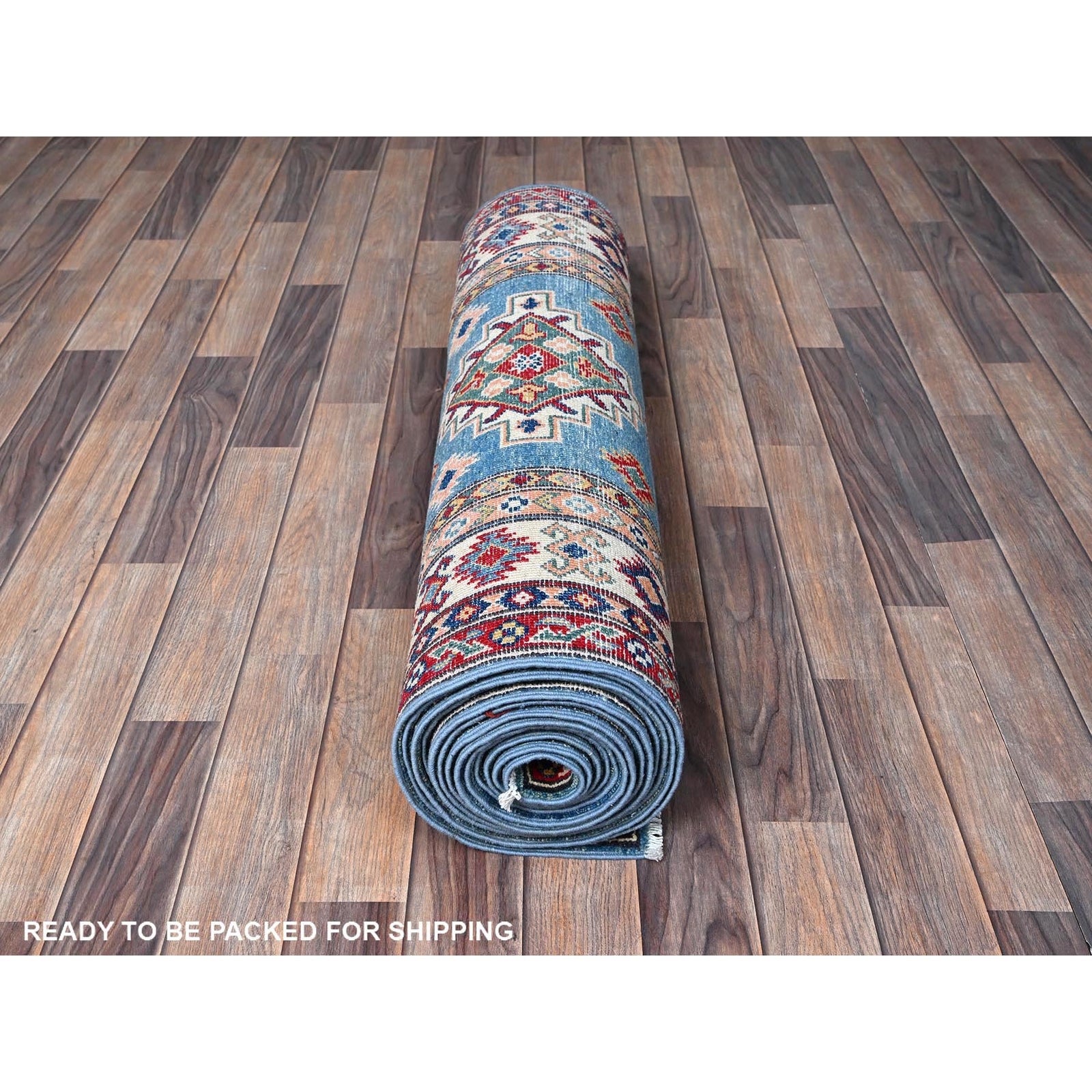 3'4"X19'6" Blue Kazak Geometric Design Soft Wool Hand Knotted Runner Rug