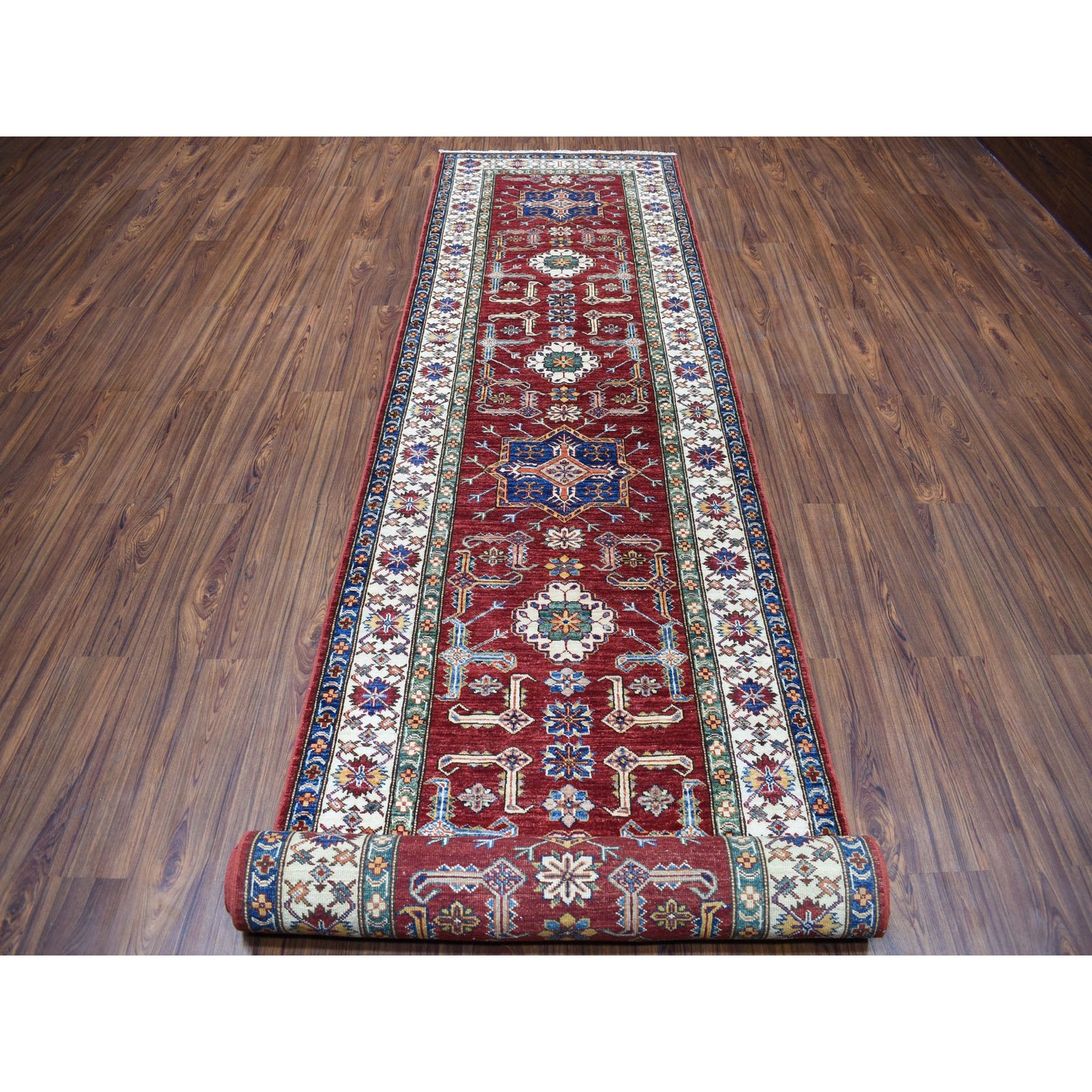 3'5"X19'3" Red Super Kazak Geometric Design Hand-Knotted Xl Runner Rug