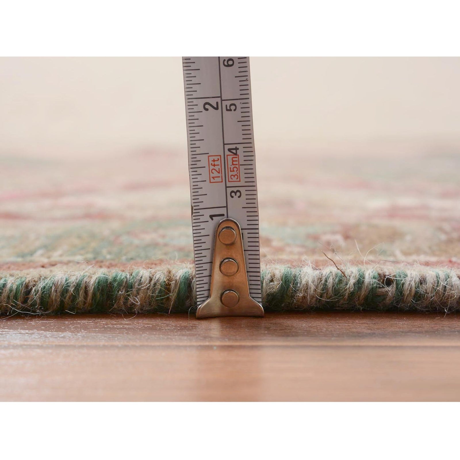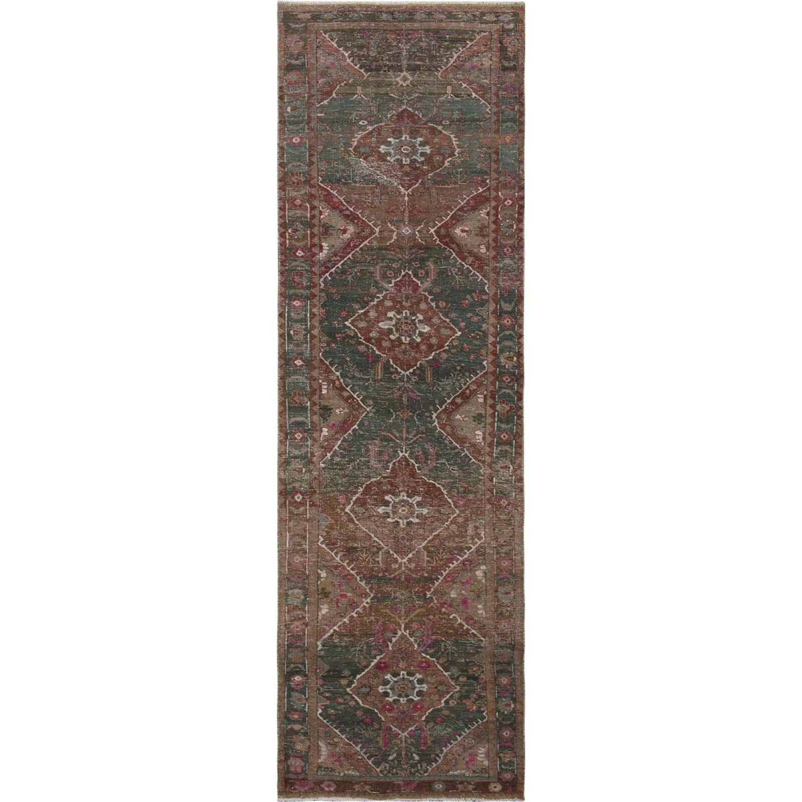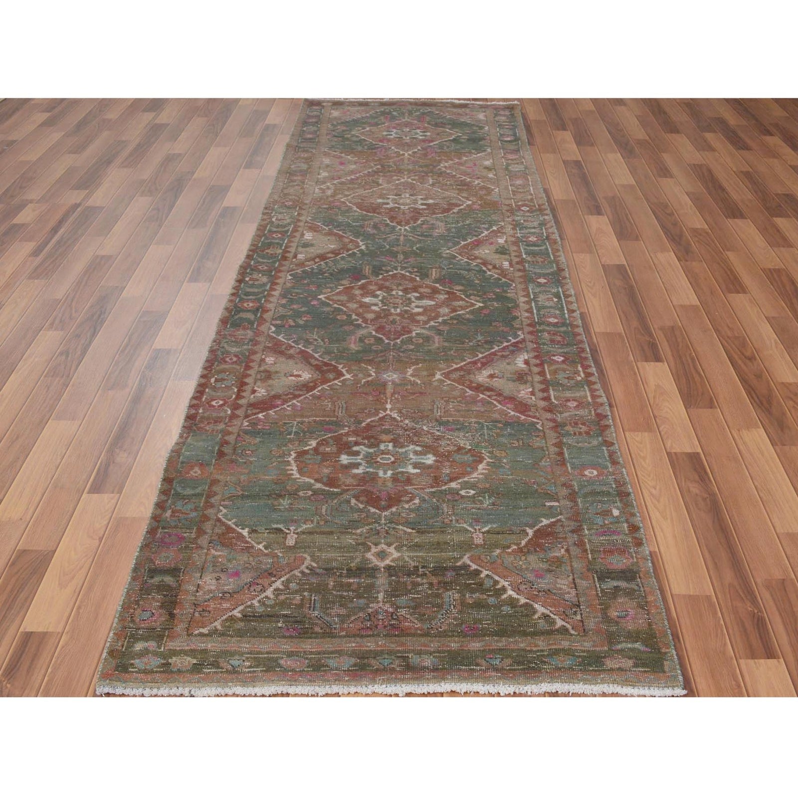3'7"X12'3" Green Vintage And Worn Down Farsian Heris Handknotted Wool Rug