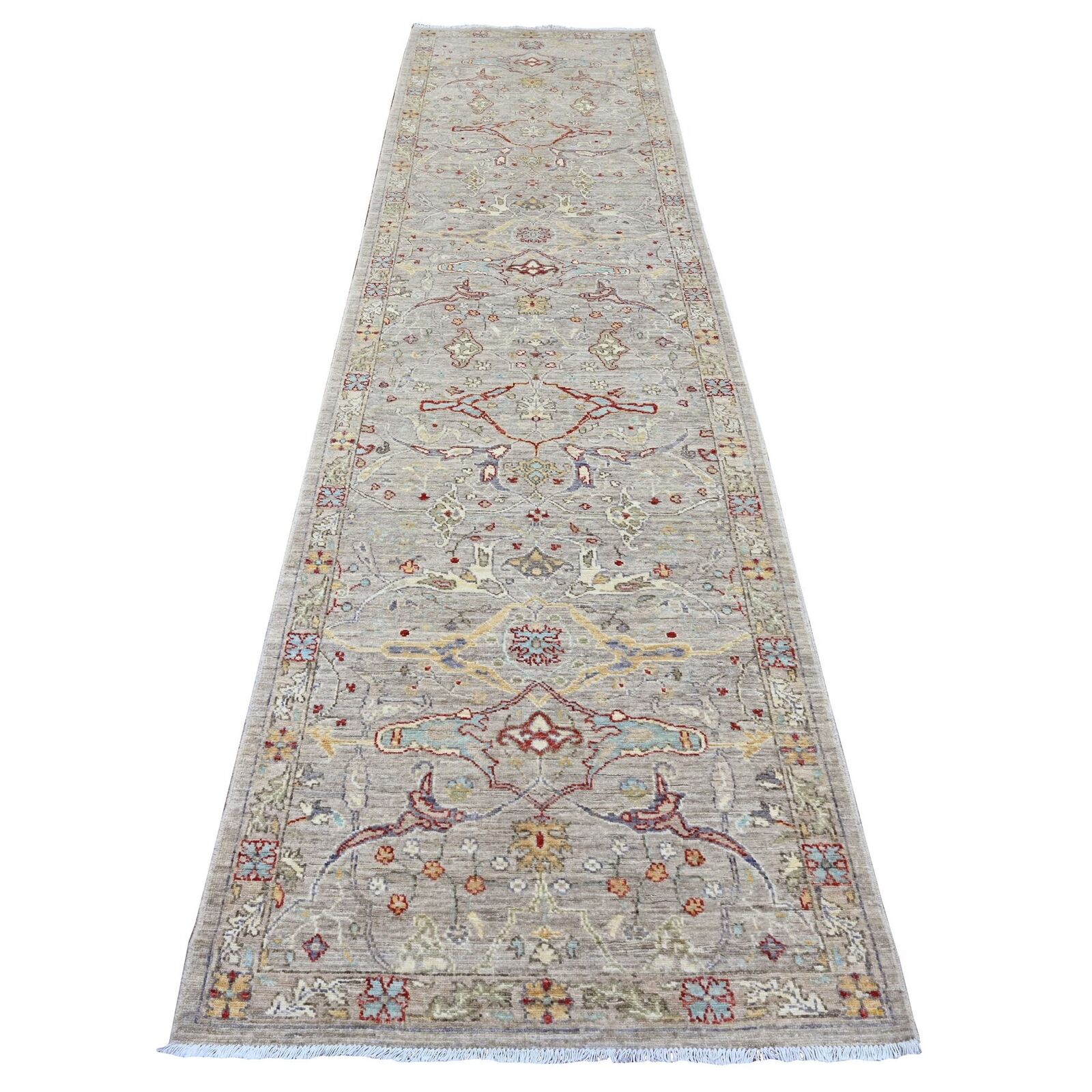 3'X11'8" Brown Peshawar Bijar Garus Design Wool Hand Knotted Runner Rug