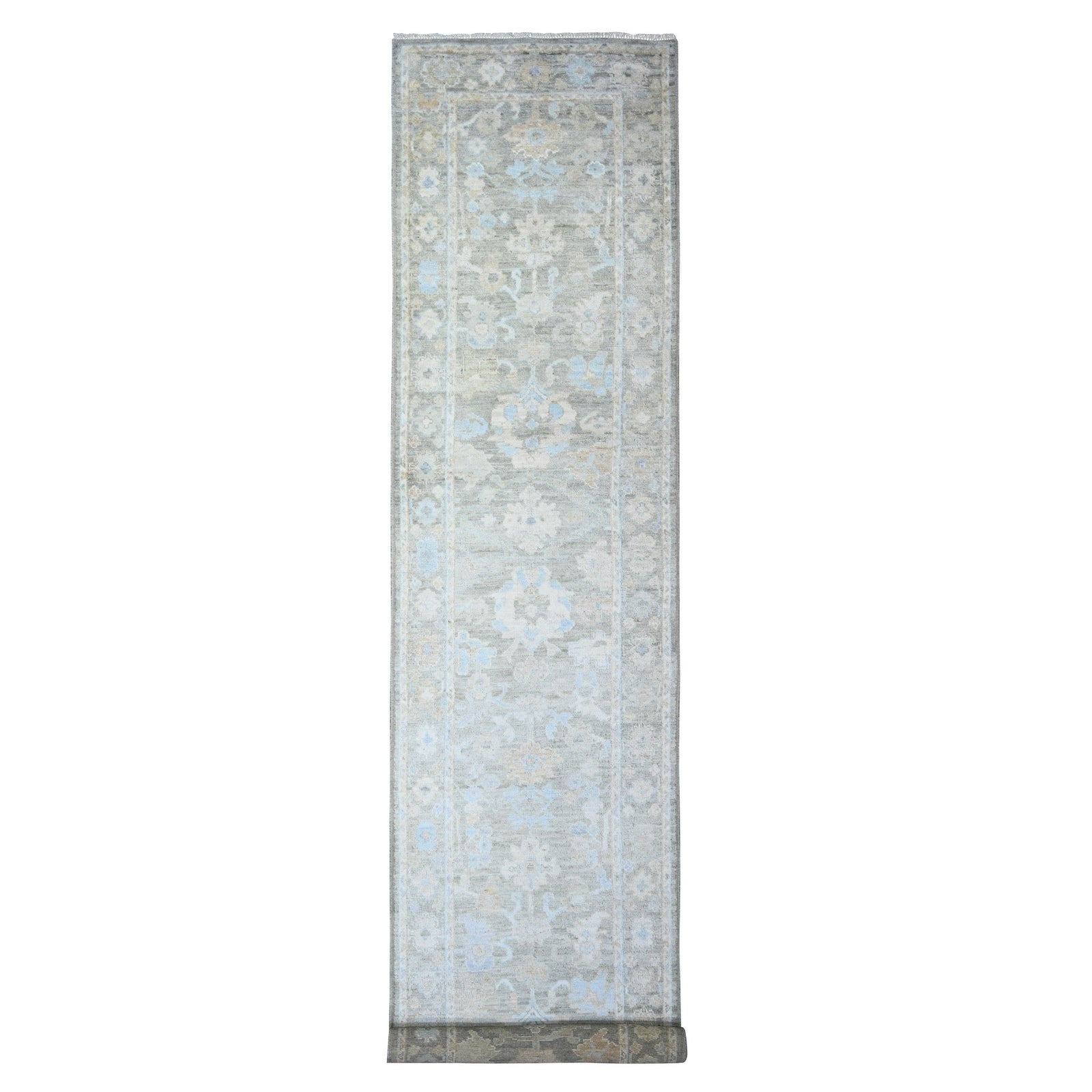 3'X15'9" Olive Gray Hand Knotted Afghan Angora Oushak Wool Xl Runner Rug