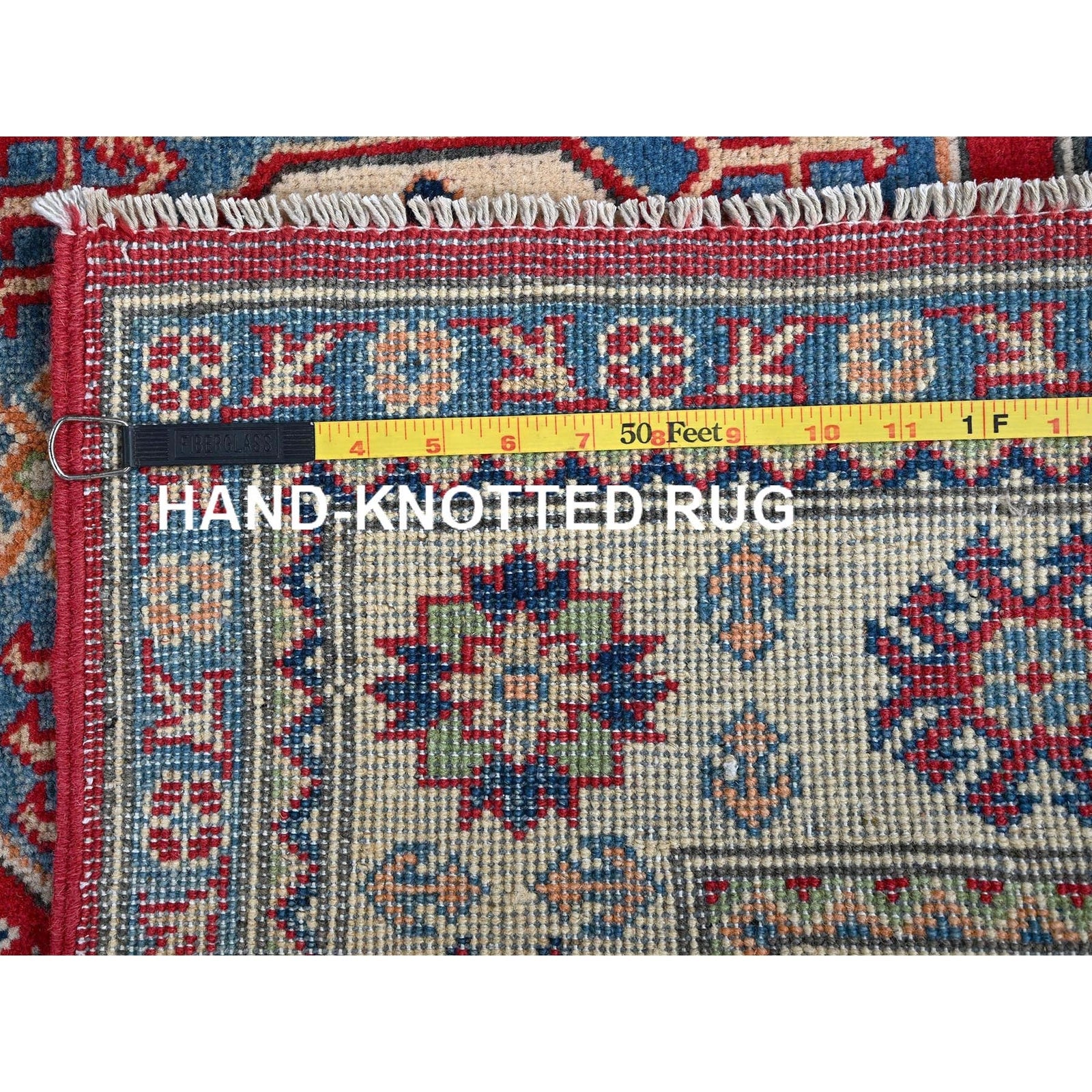 4'X5'8" Arsenal Red Kazak With Geometric Design Hand Knotted Soft Wool Rug