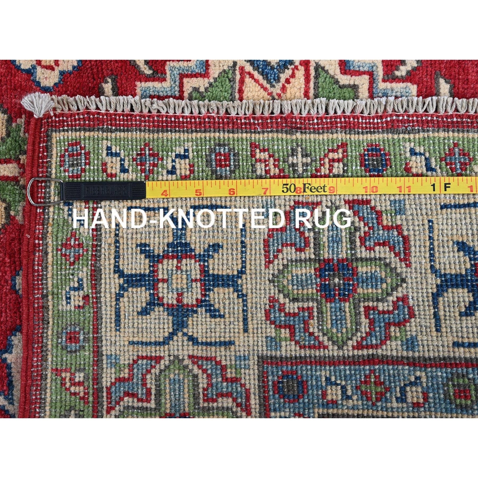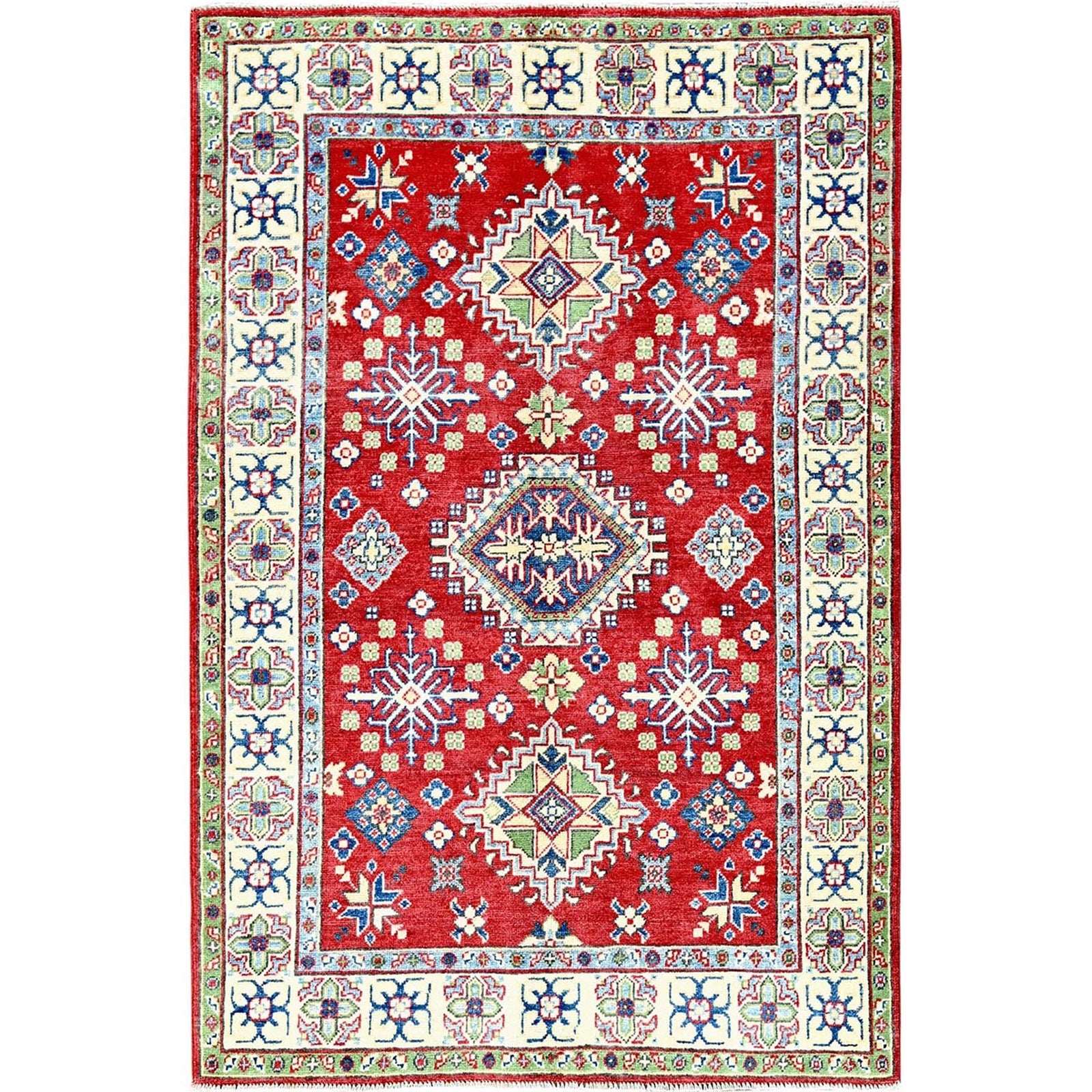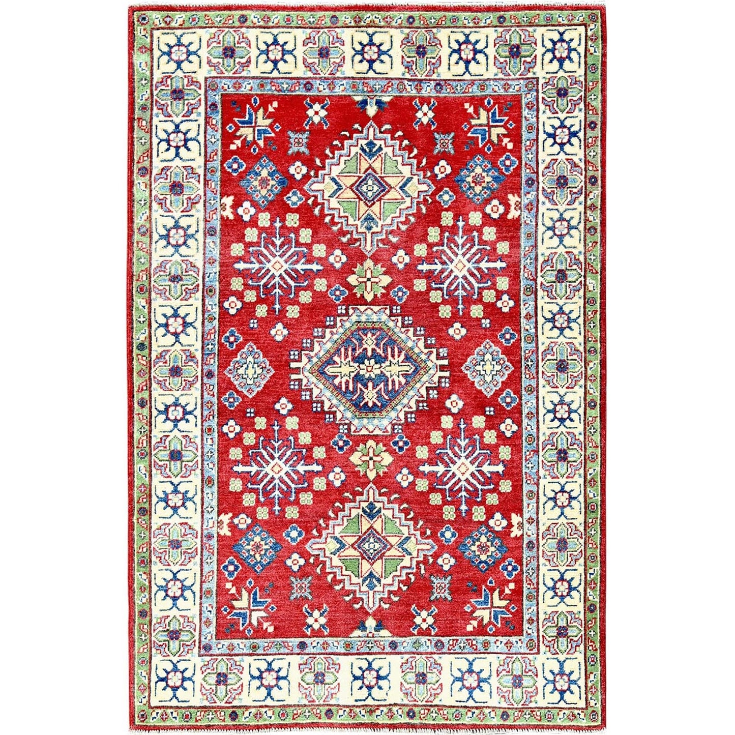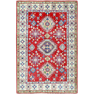 4'X6' Crimson Red Kazak With Tribal Motifs Hand Knotted Pure Wool Rug