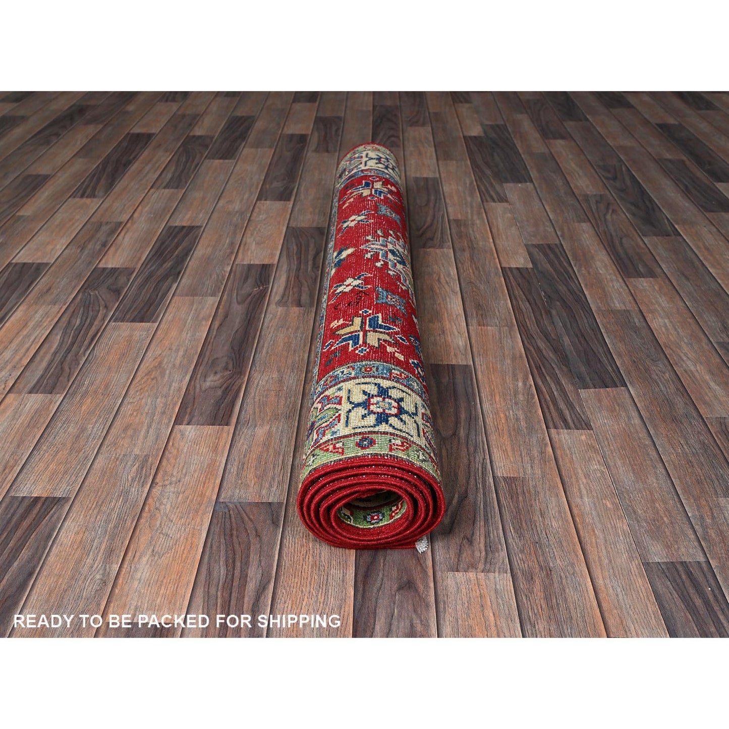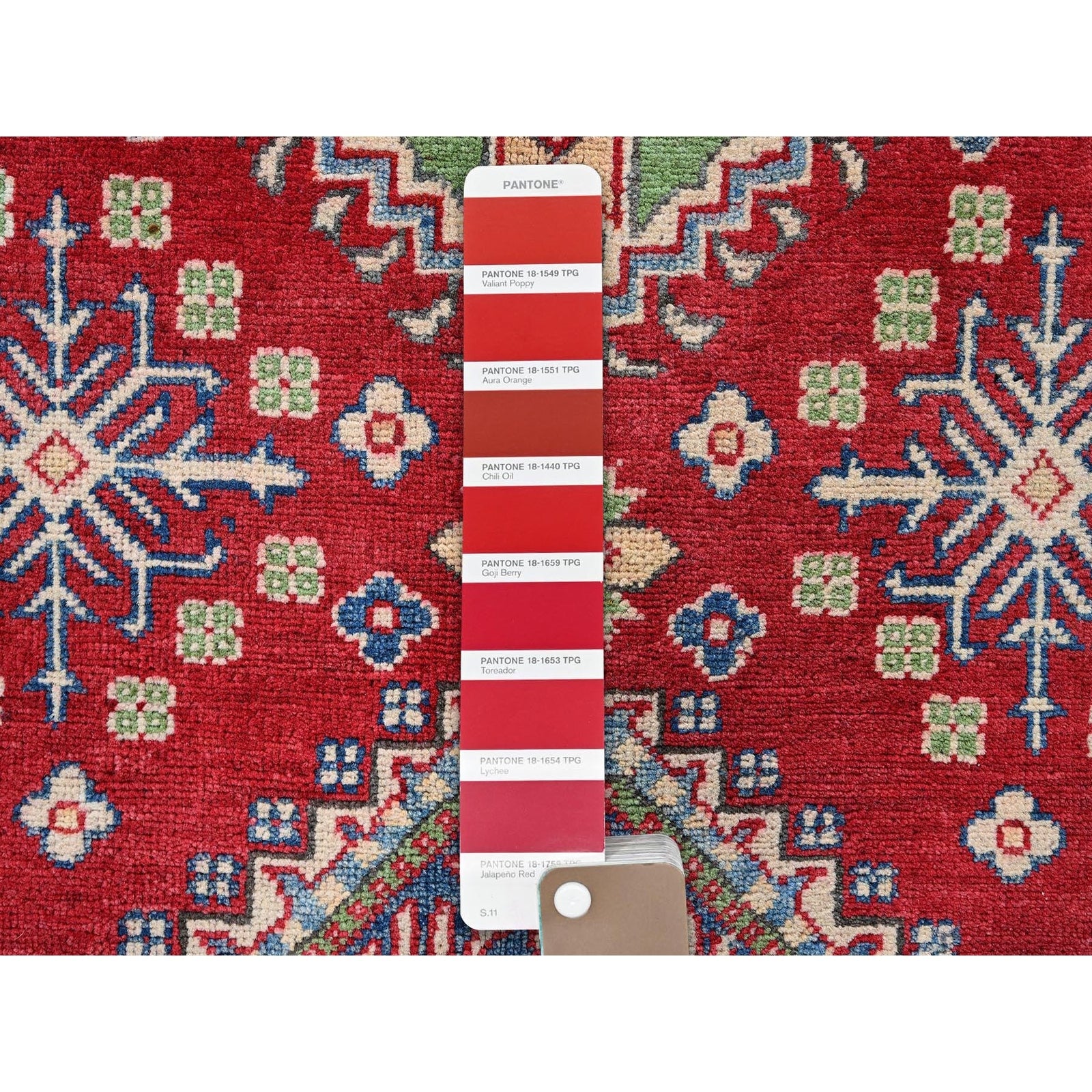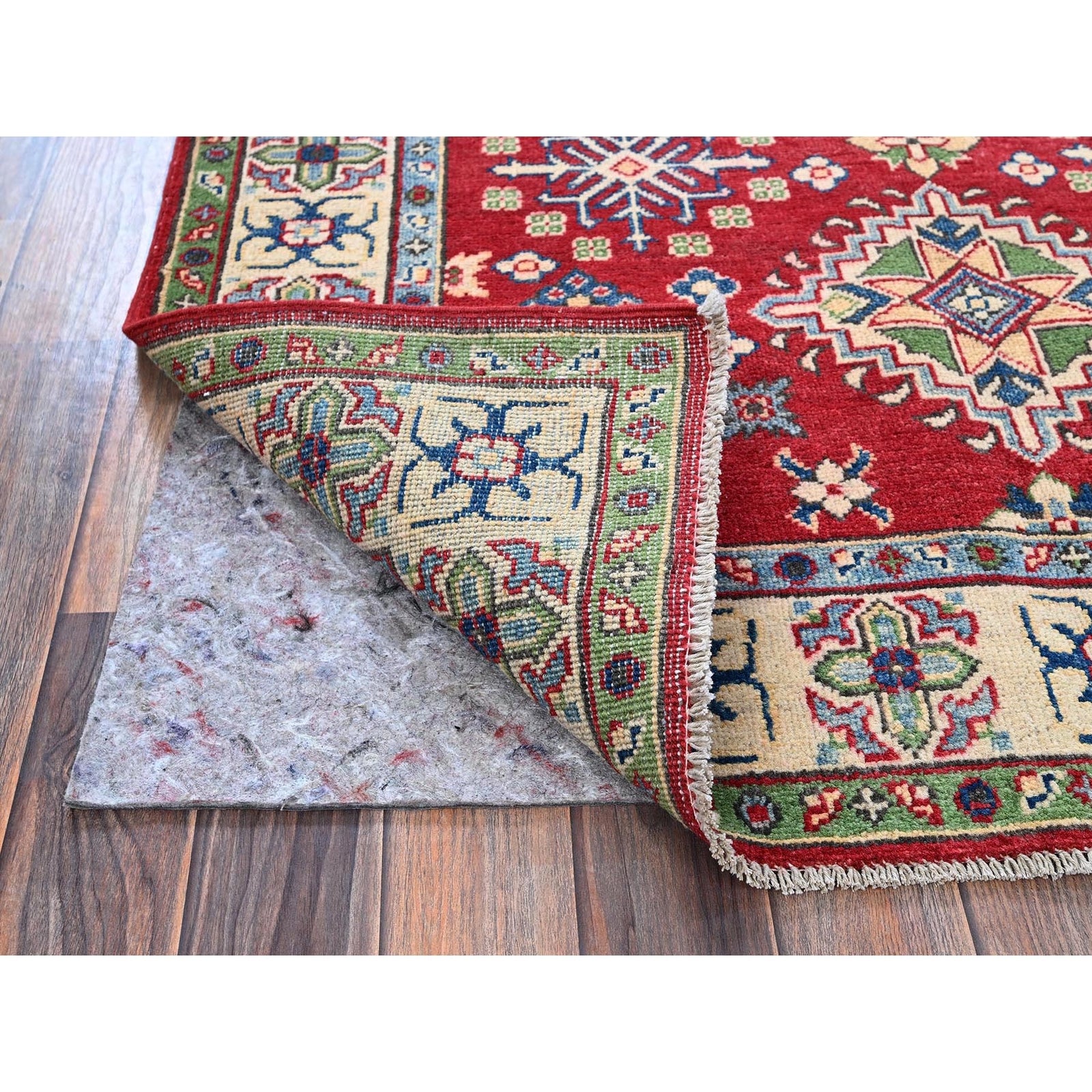 4'X6' Crimson Red Kazak With Tribal Motifs Hand Knotted Pure Wool Rug
