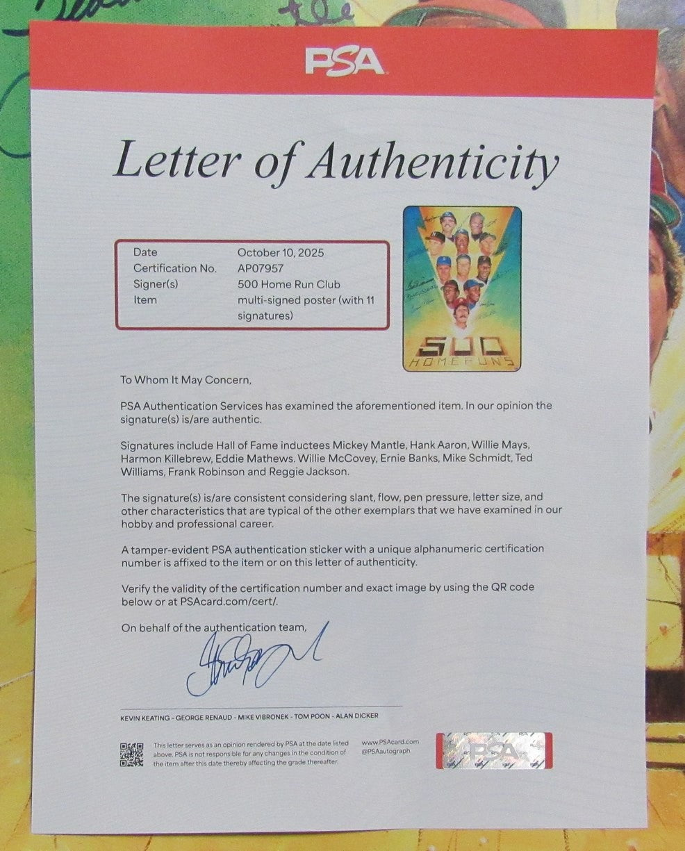 500 Home Run Club Signed By 11 Poster Mantle Williams Mays + Psa/Dna 201597