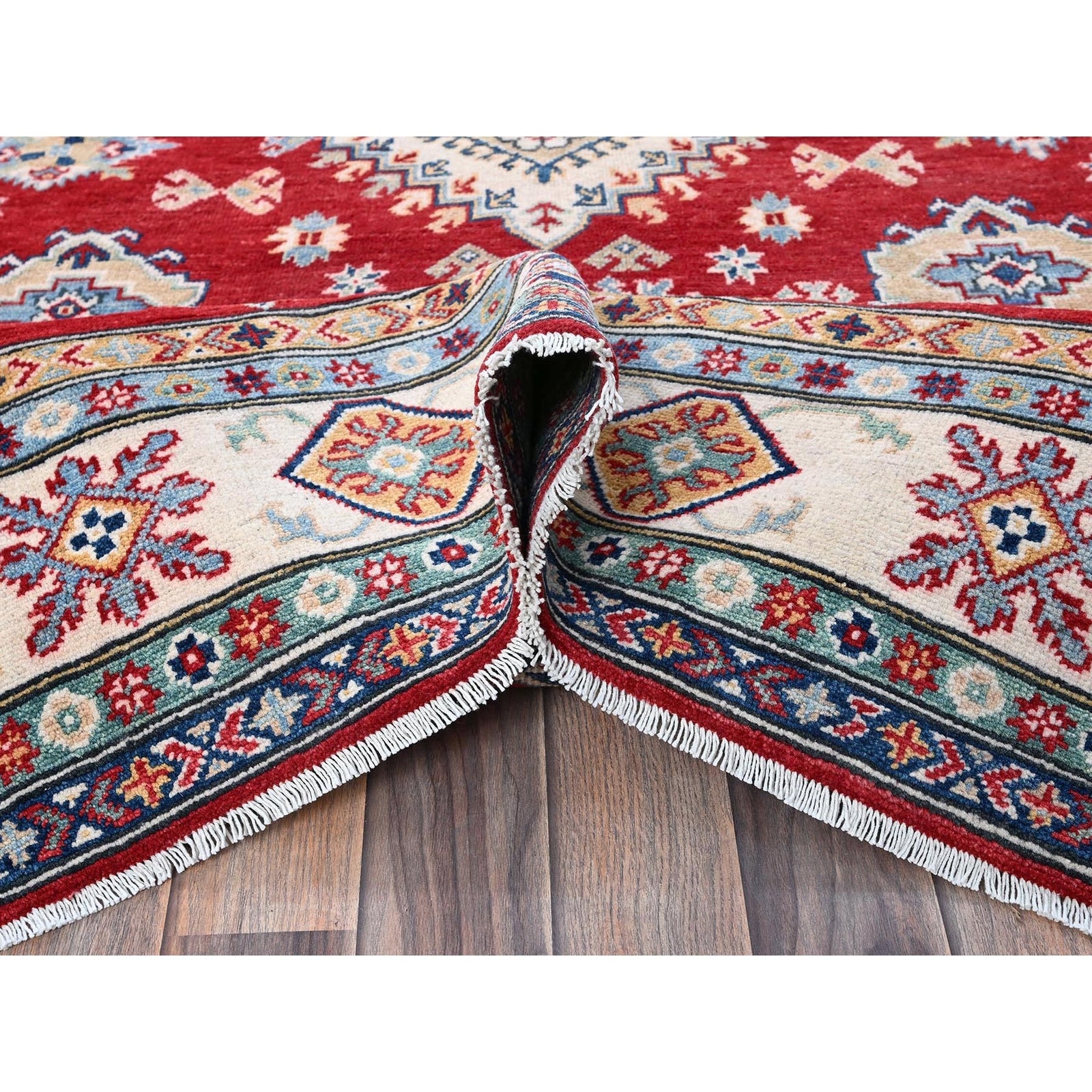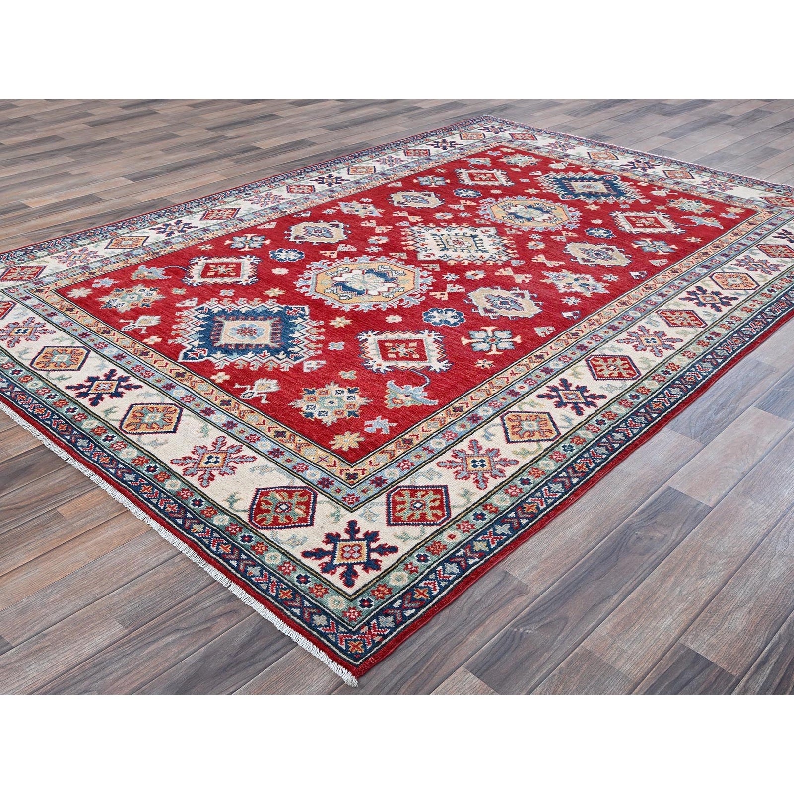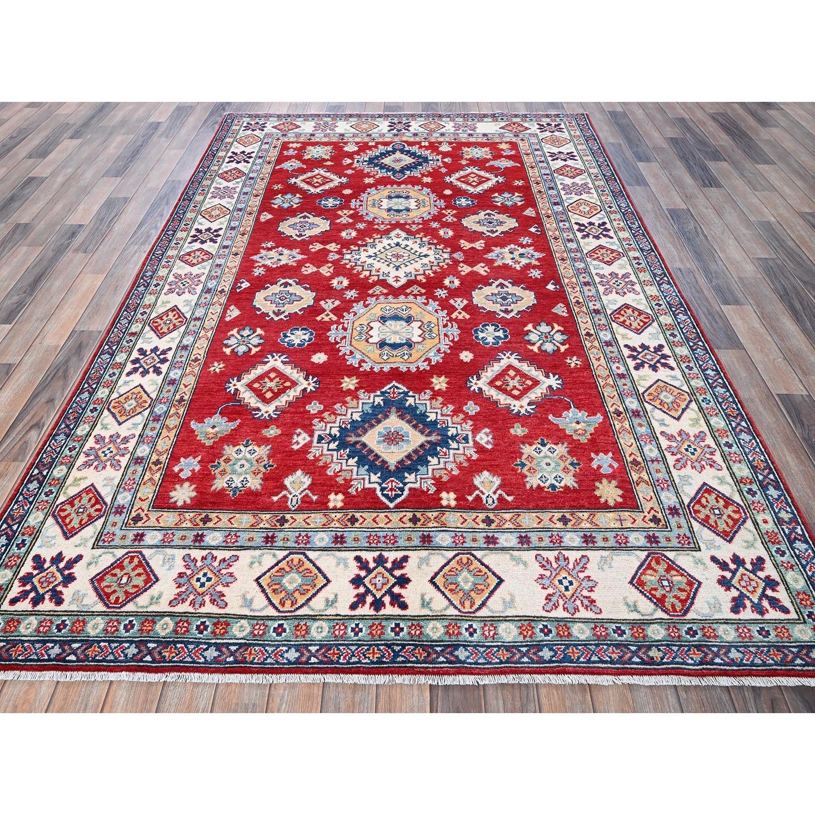 5'10"X8'8" Red Kazak With Geometric Medallions Design Wool Hand Knotted Rug