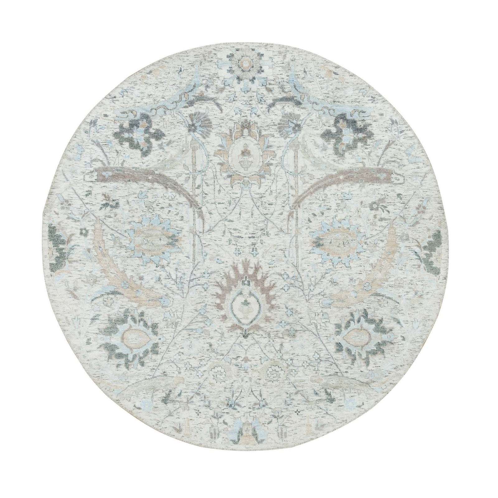 5'X5' Ivory Hand Knotted Sickle Leaf Design Silk With Wool Round Rug