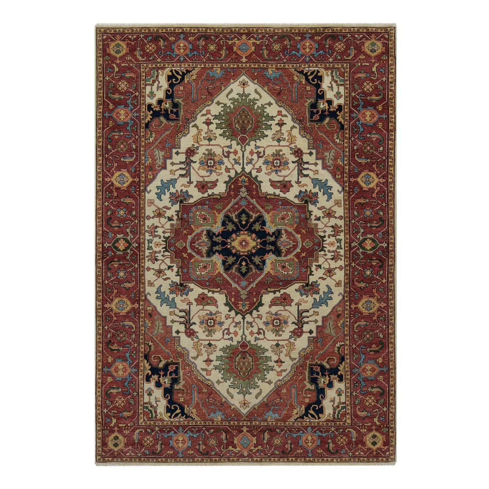 6'2"X9'1" Ivory Antiqued Heris Re-Creation Hand Knotted Soft Wool Rug