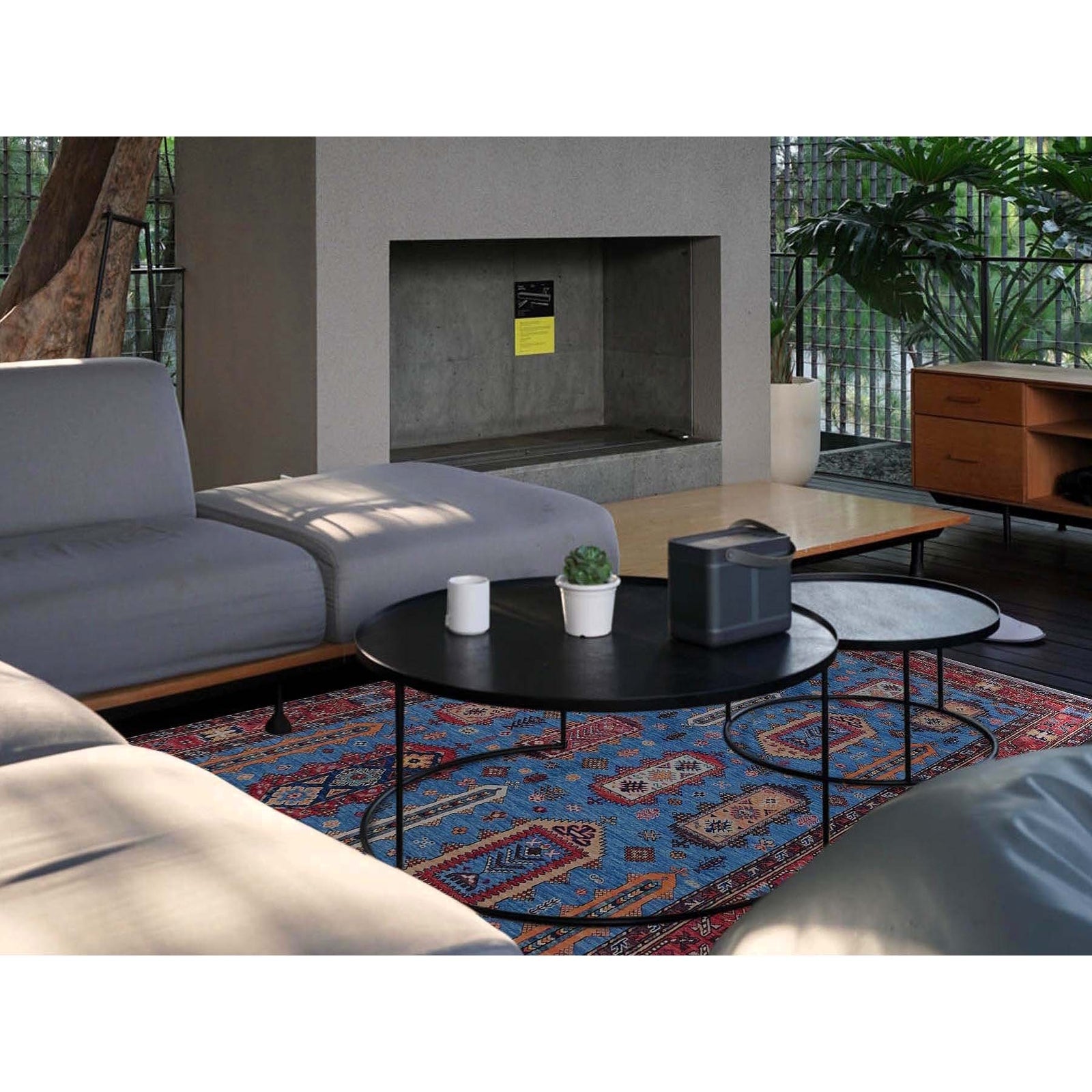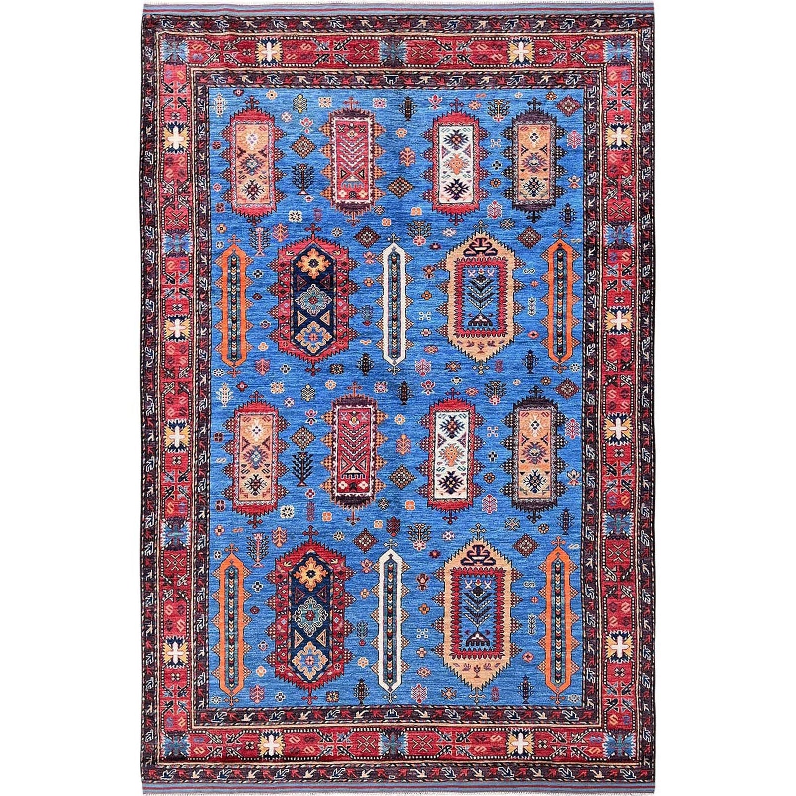 6'3"X9'1" Blue Afghan Caucasian Design Revival Hand Knotted Soft Wool Rug