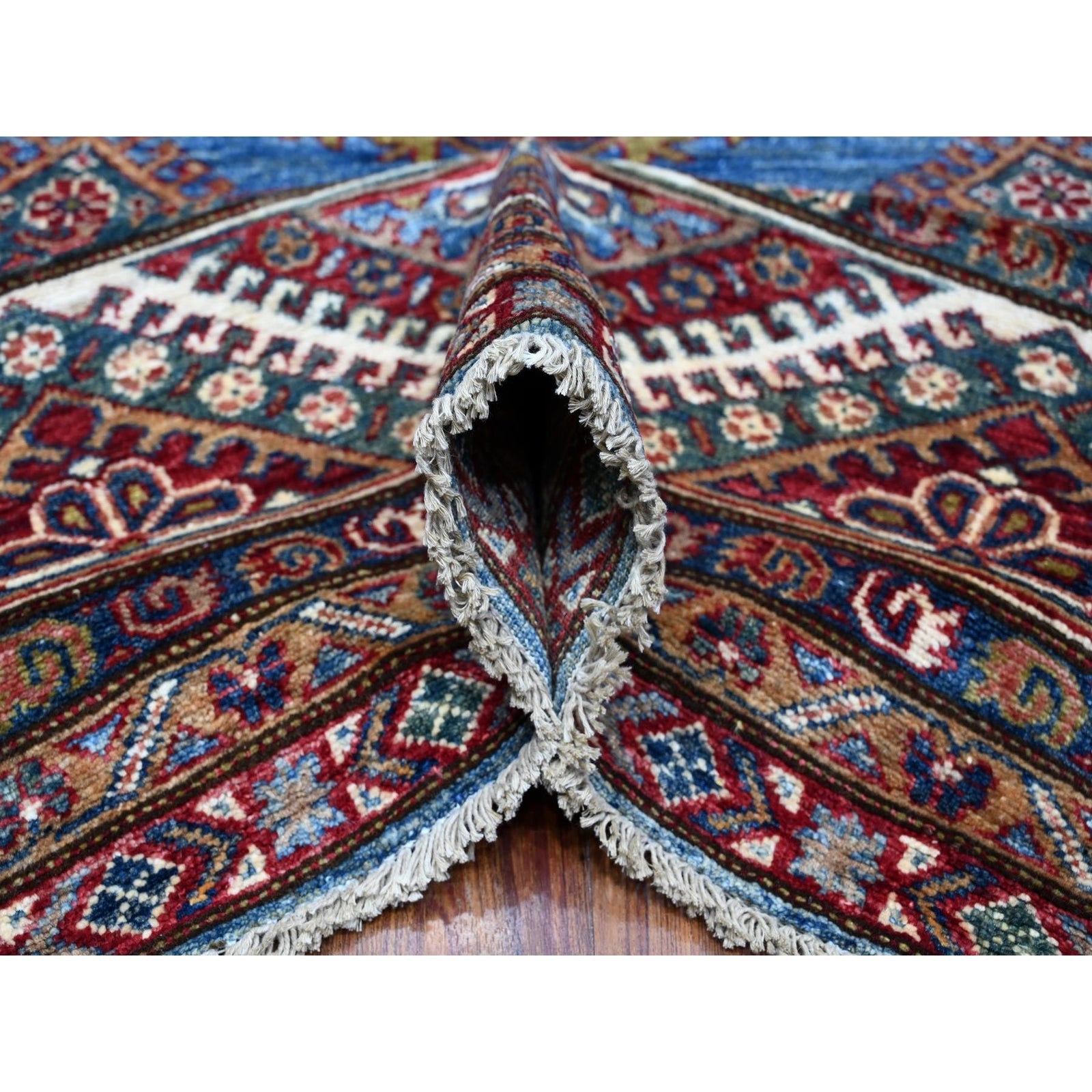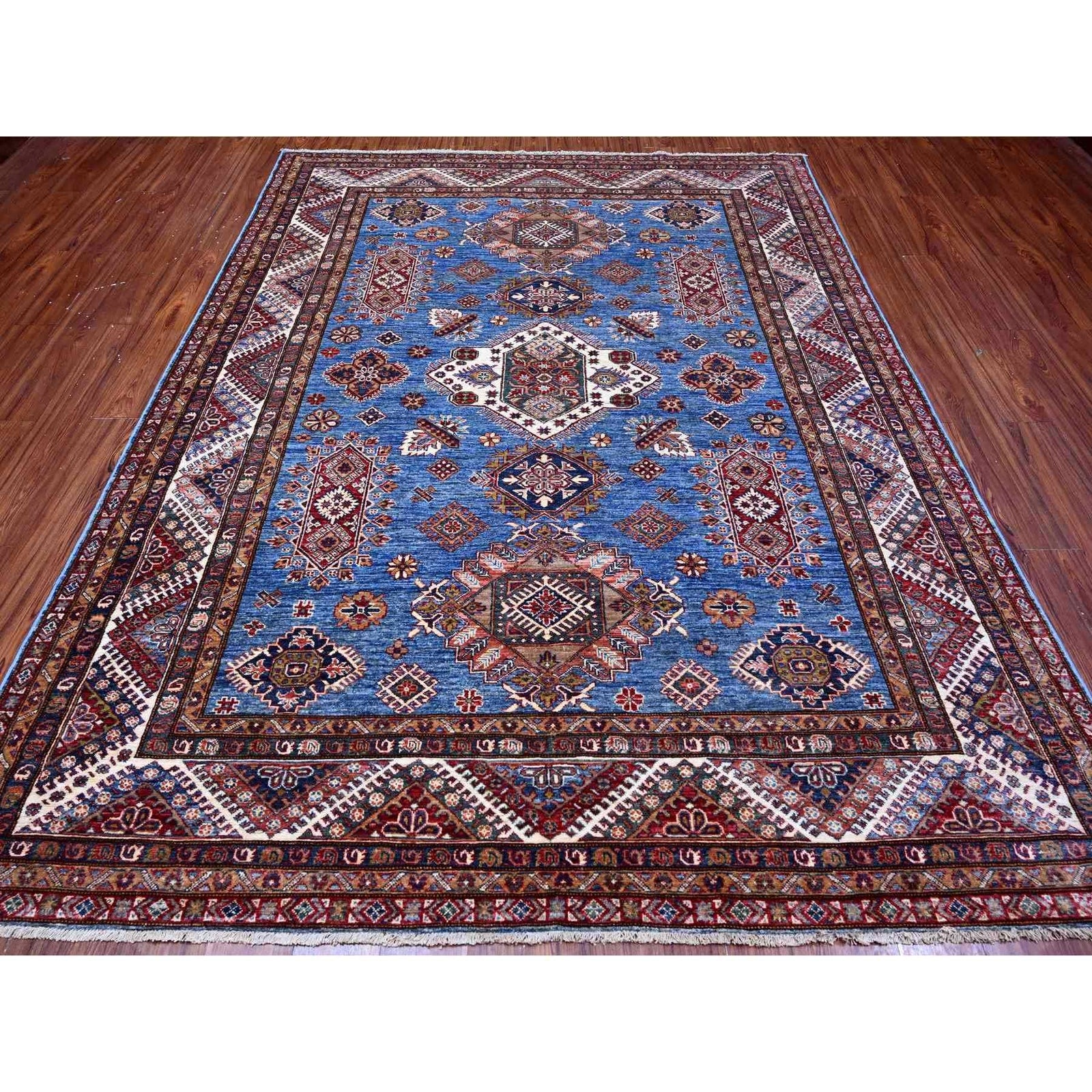 7'10"X10' Busty Blue Hand Knotted Wool Super Kazak Large Medallions Rug