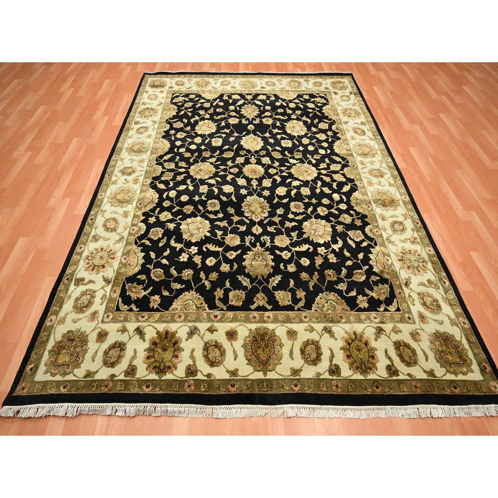 7'9"X10' Black Wool And Silk Hand Knotted Rajasthan All Over Design Rug