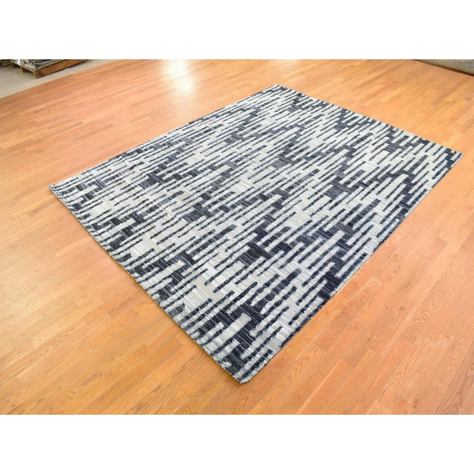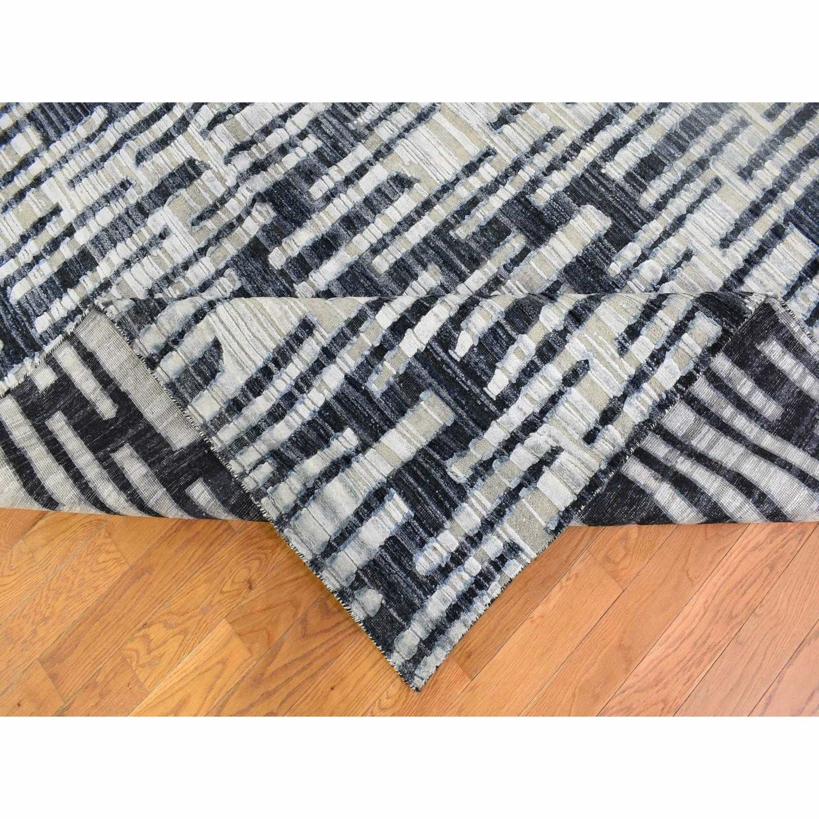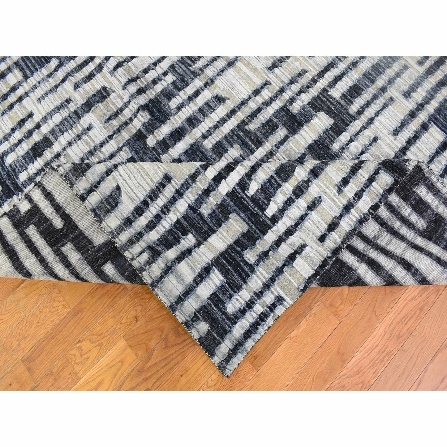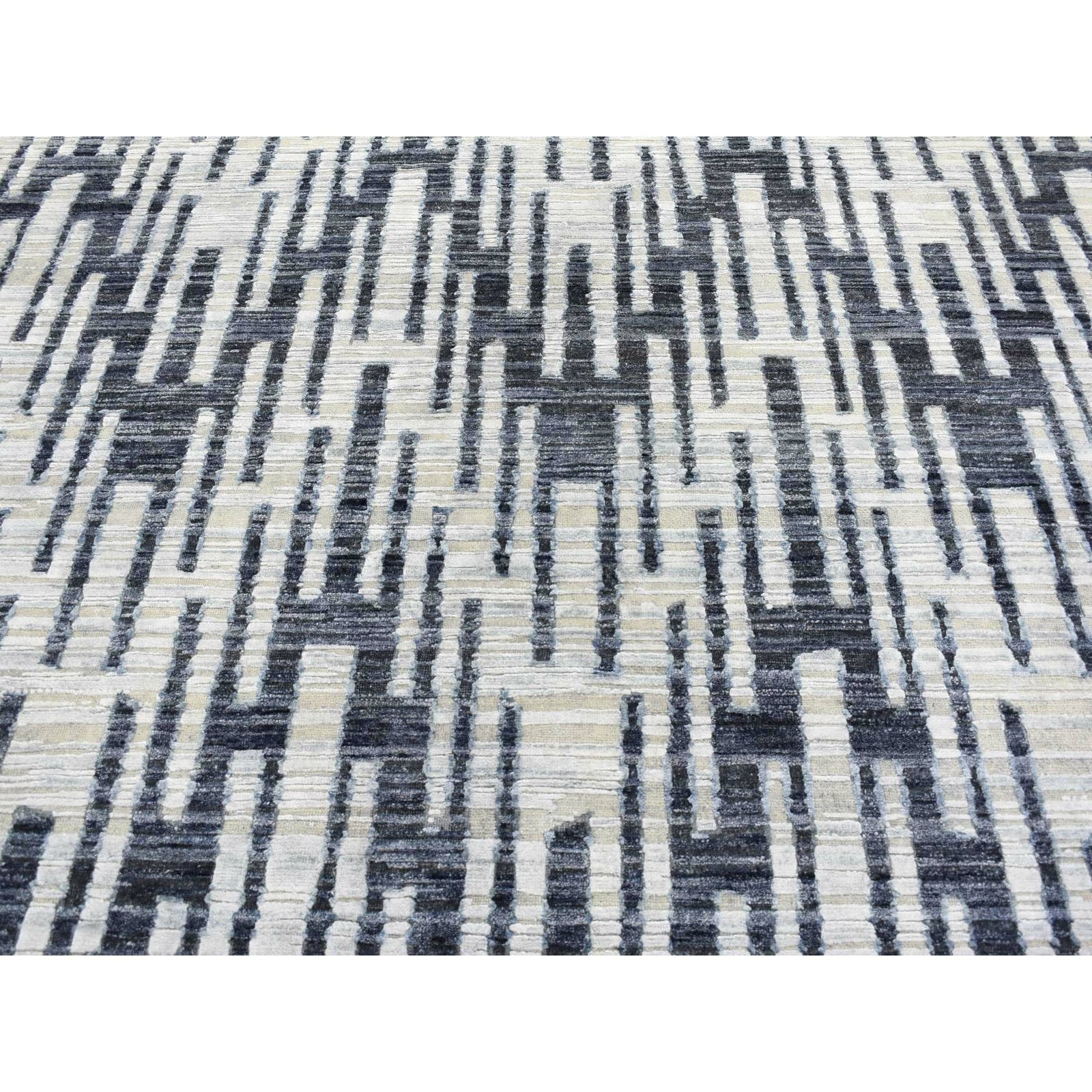 8'X10'1" Zig Zag Design Black And White Pure Silk And Textured Wool Rug