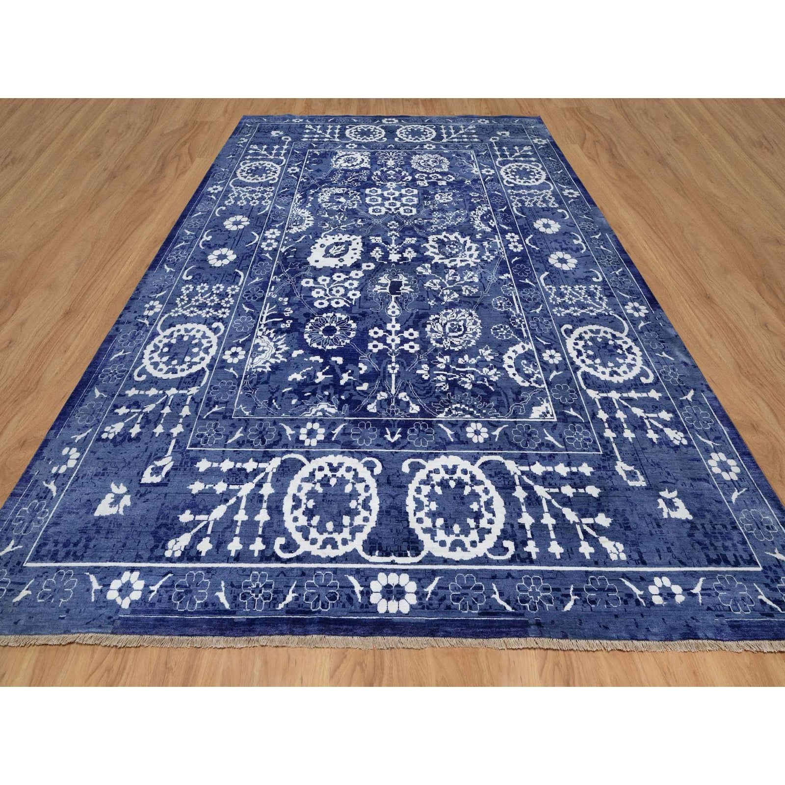 9'10"X14' Blue Tebraz With Leaf Design Hand Knotted Wool And Silk Rug