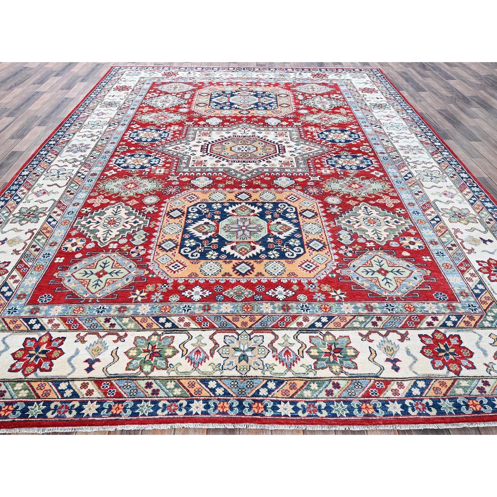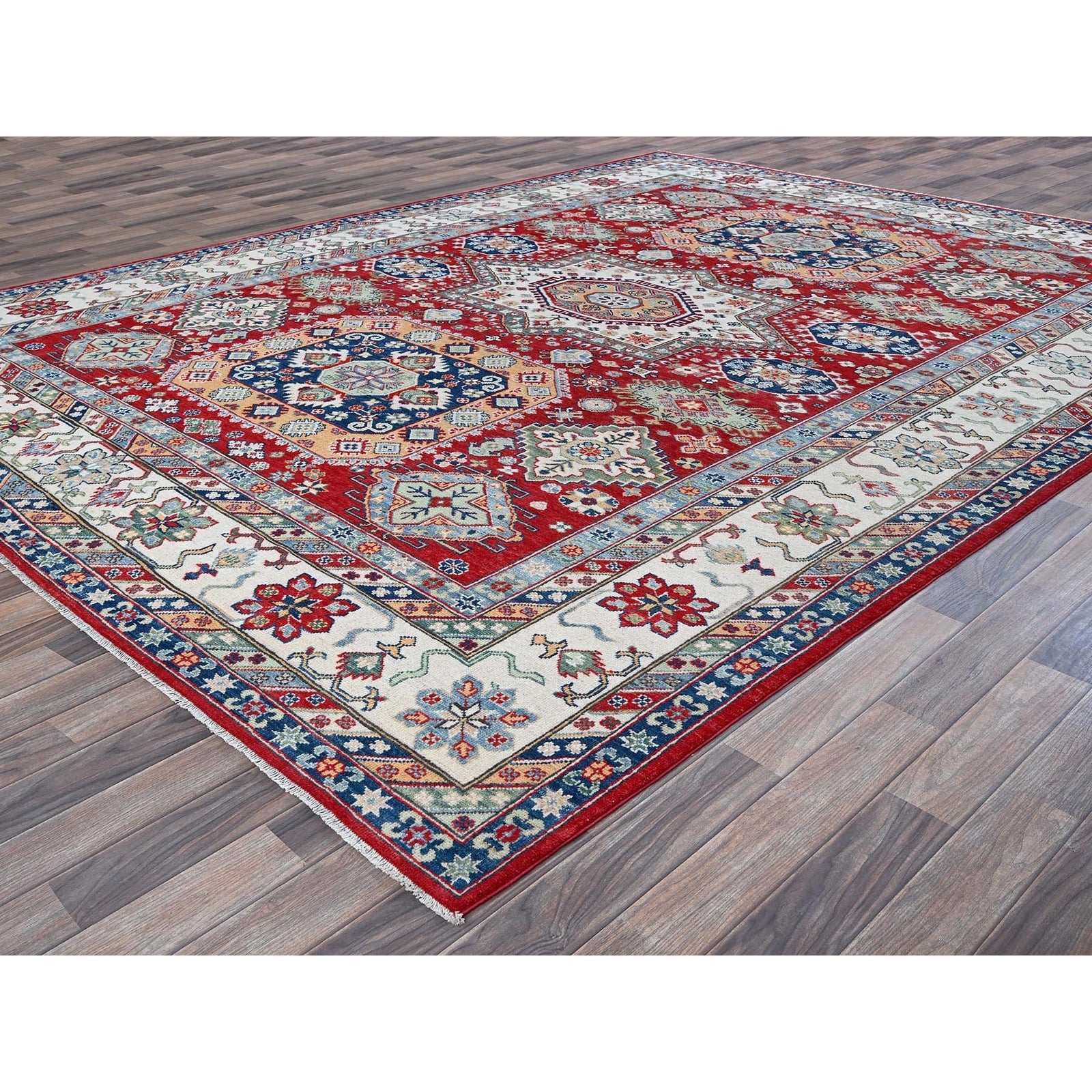 9'1"X11'9" Berry Red Kazak With Geometric Design Hand Knotted Soft Wool Rug