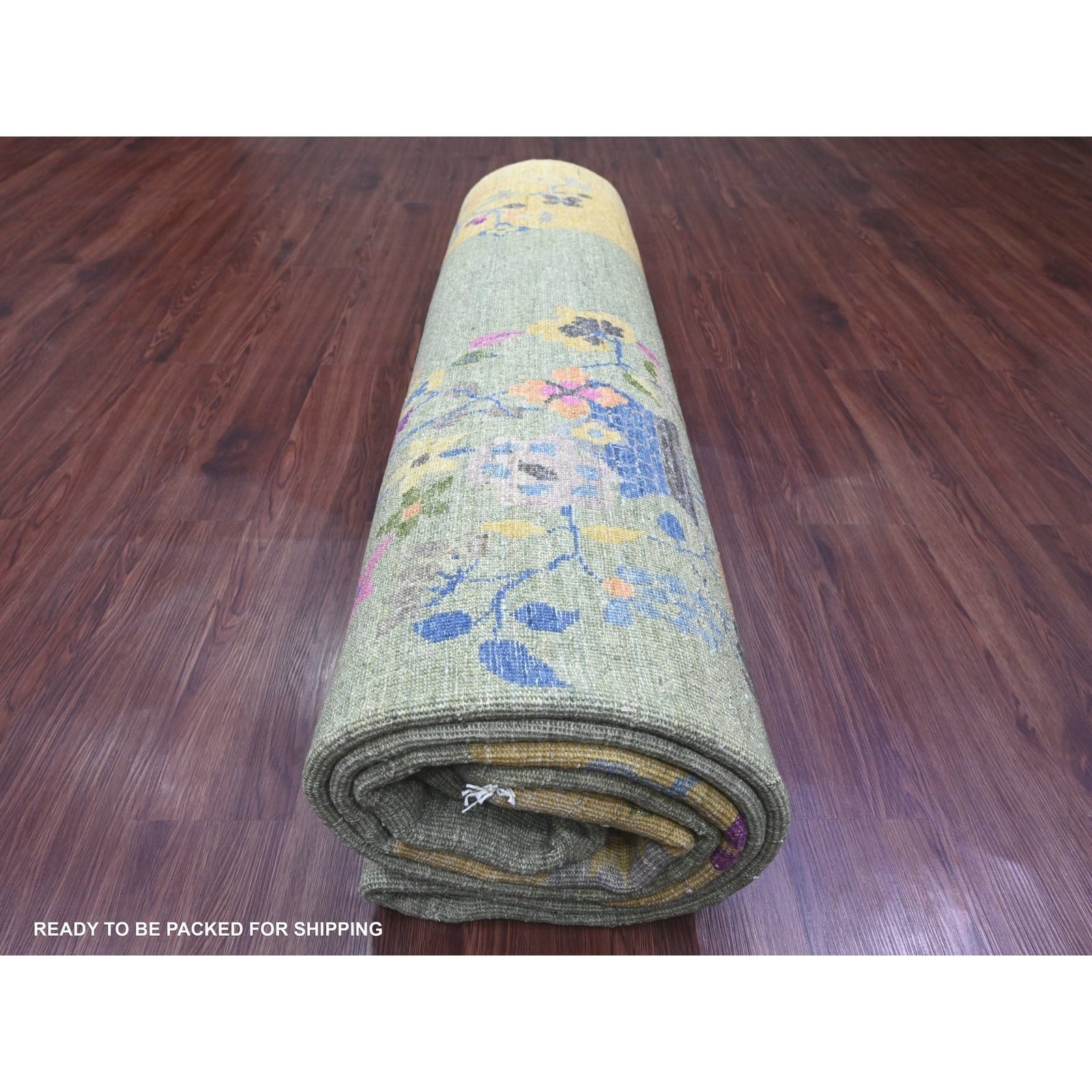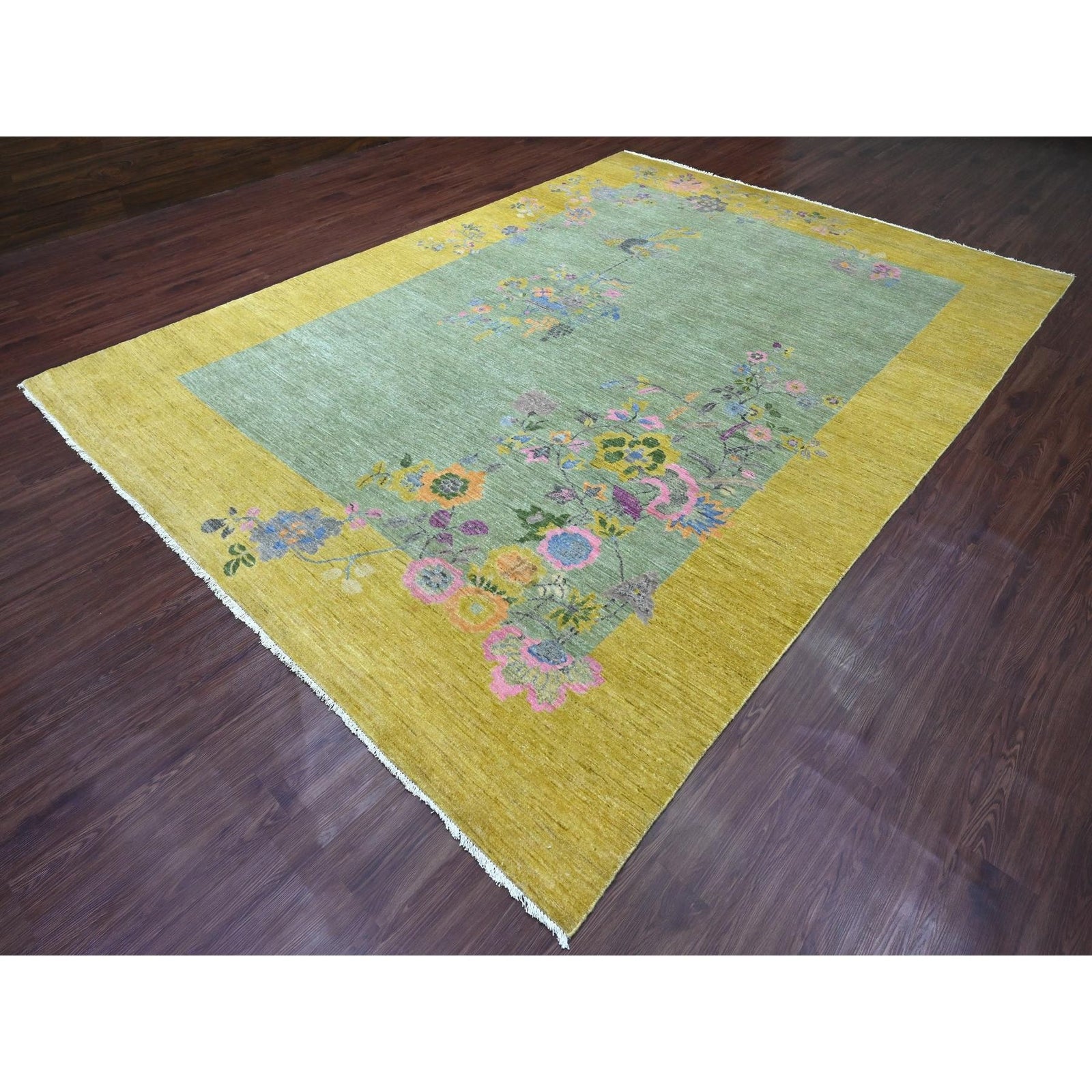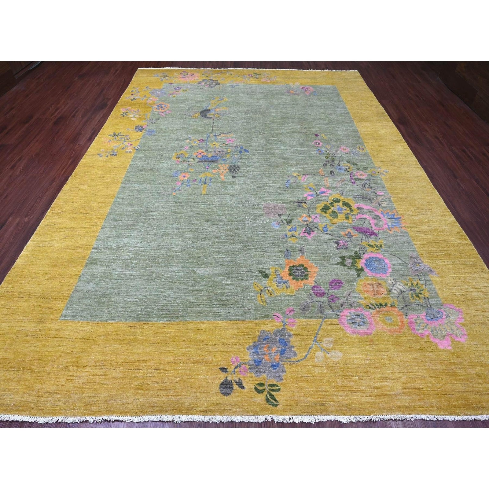 9'1"X12'5" Green Chinese Art Deco Inspired Peshawar Hand Knotted Wool Rug