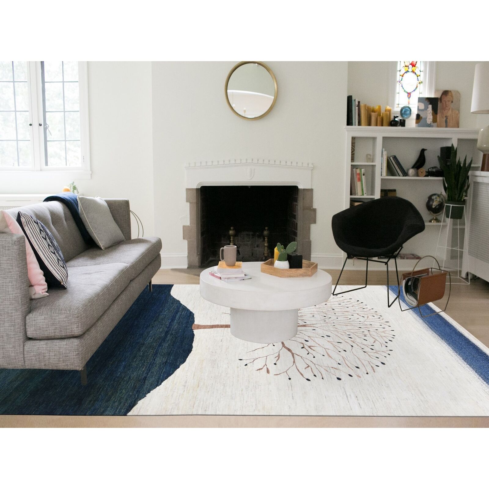 9'8"X13'8" Ivory Hand Knotted Modern Folk Art Tree Design Gabbeh Wool Rug